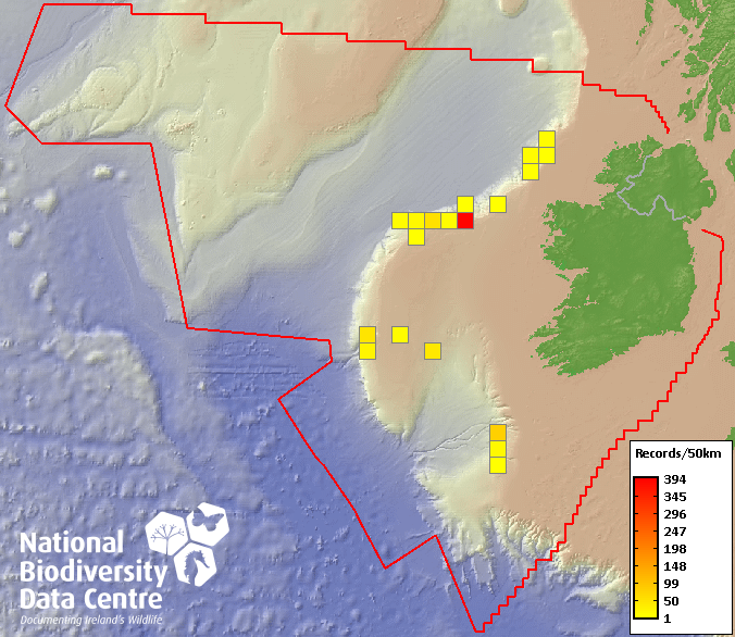 Distribution of the number of records recorded within each 10km grid square (ITM).Marine Map - 50km