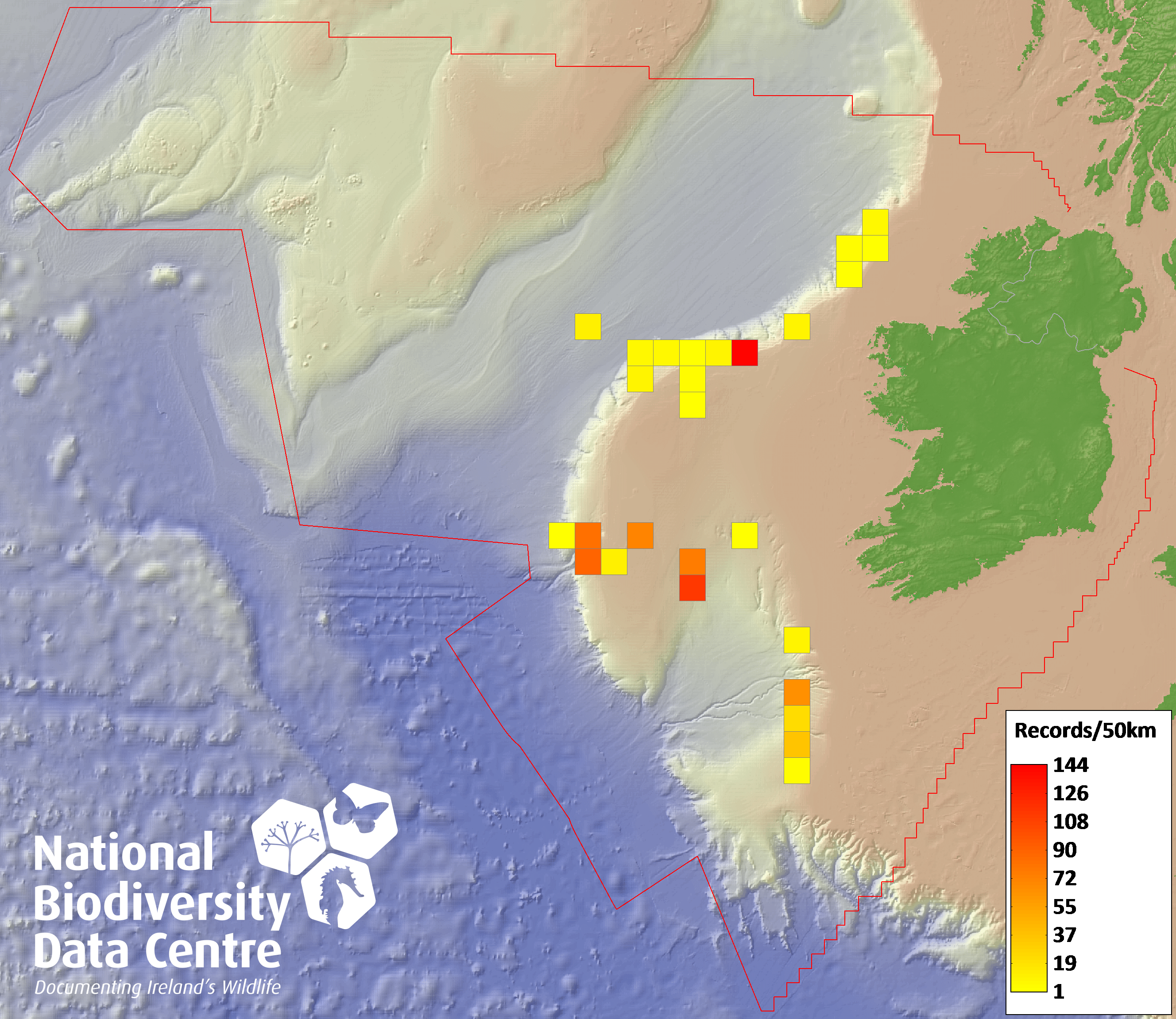 Distribution of the number of records recorded within each 10km grid square (ITM).Marine Map - 50km