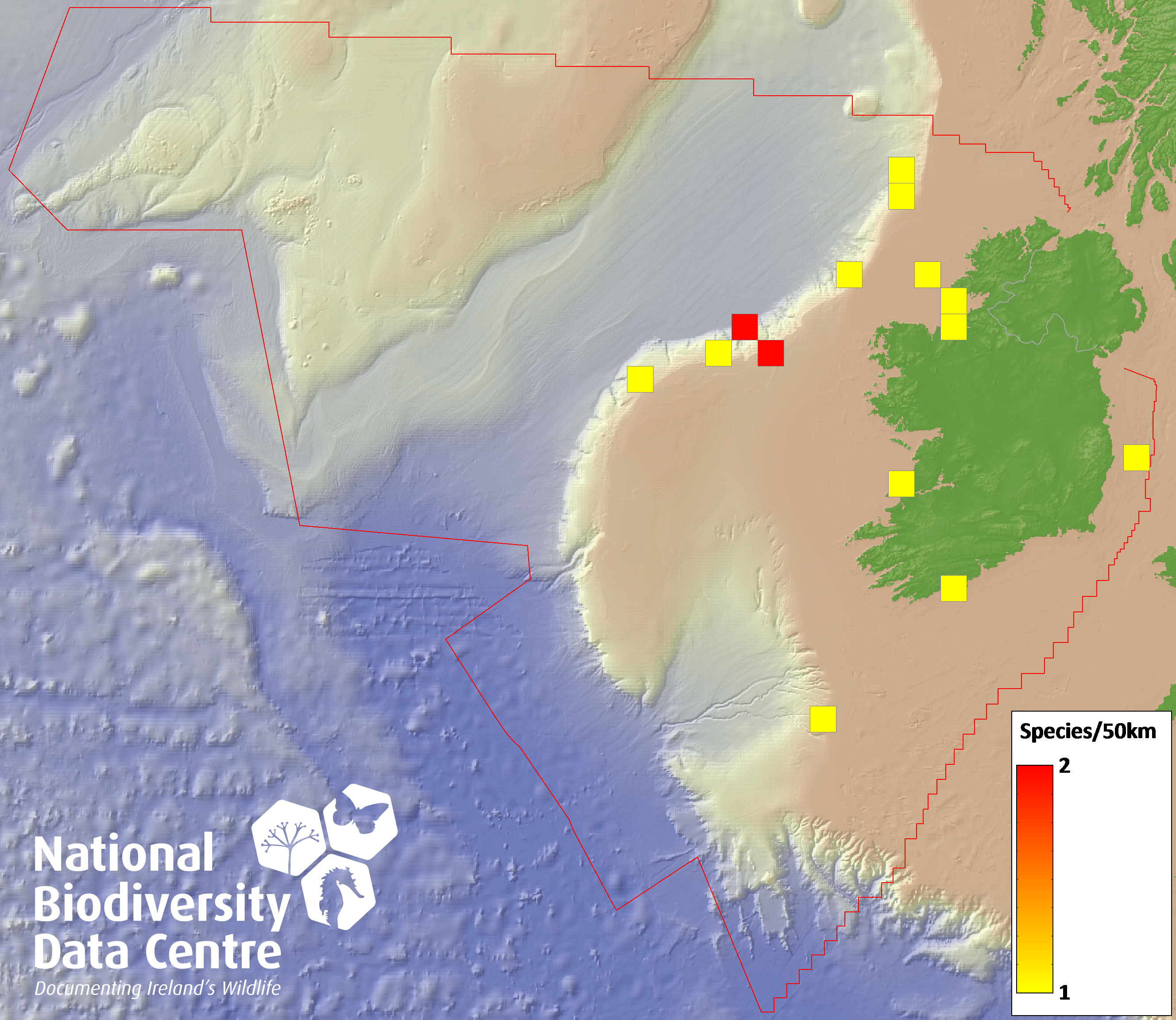 Distribution of the number of records within each 10km grid square (ITM).Marine Map - 50Km