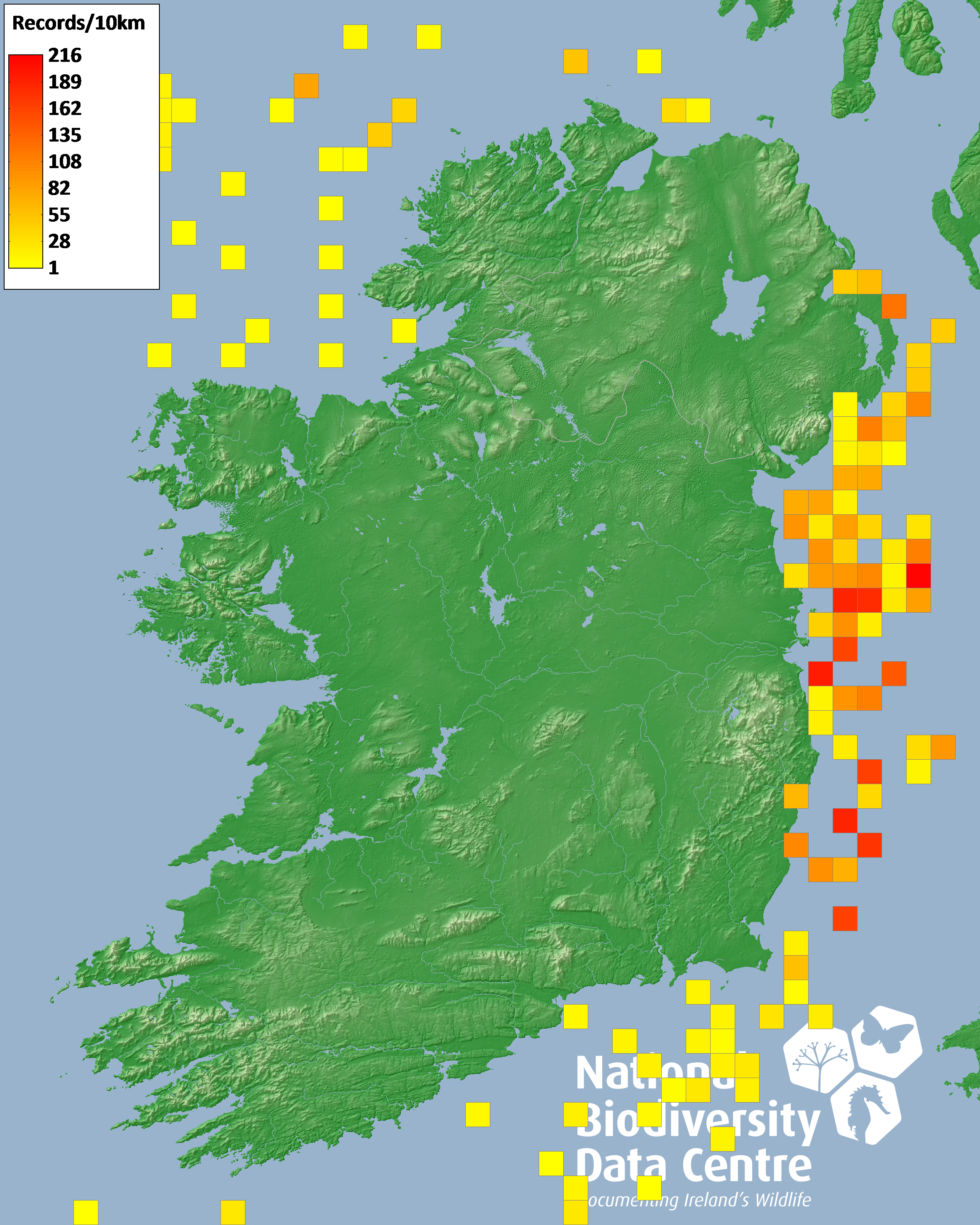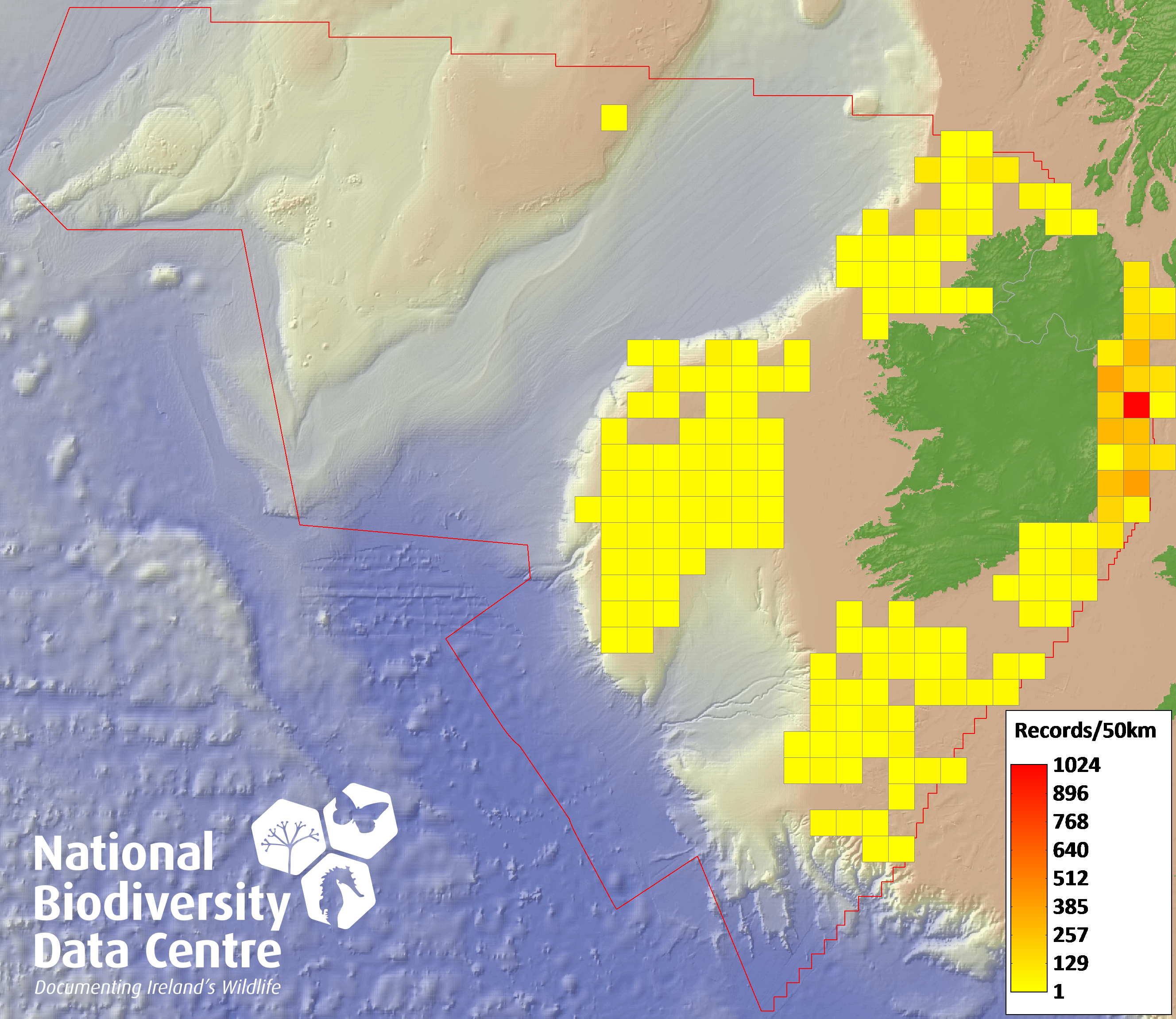 Distribution of the number of records within each 10km grid square (ITM).Marine Map - 50Km