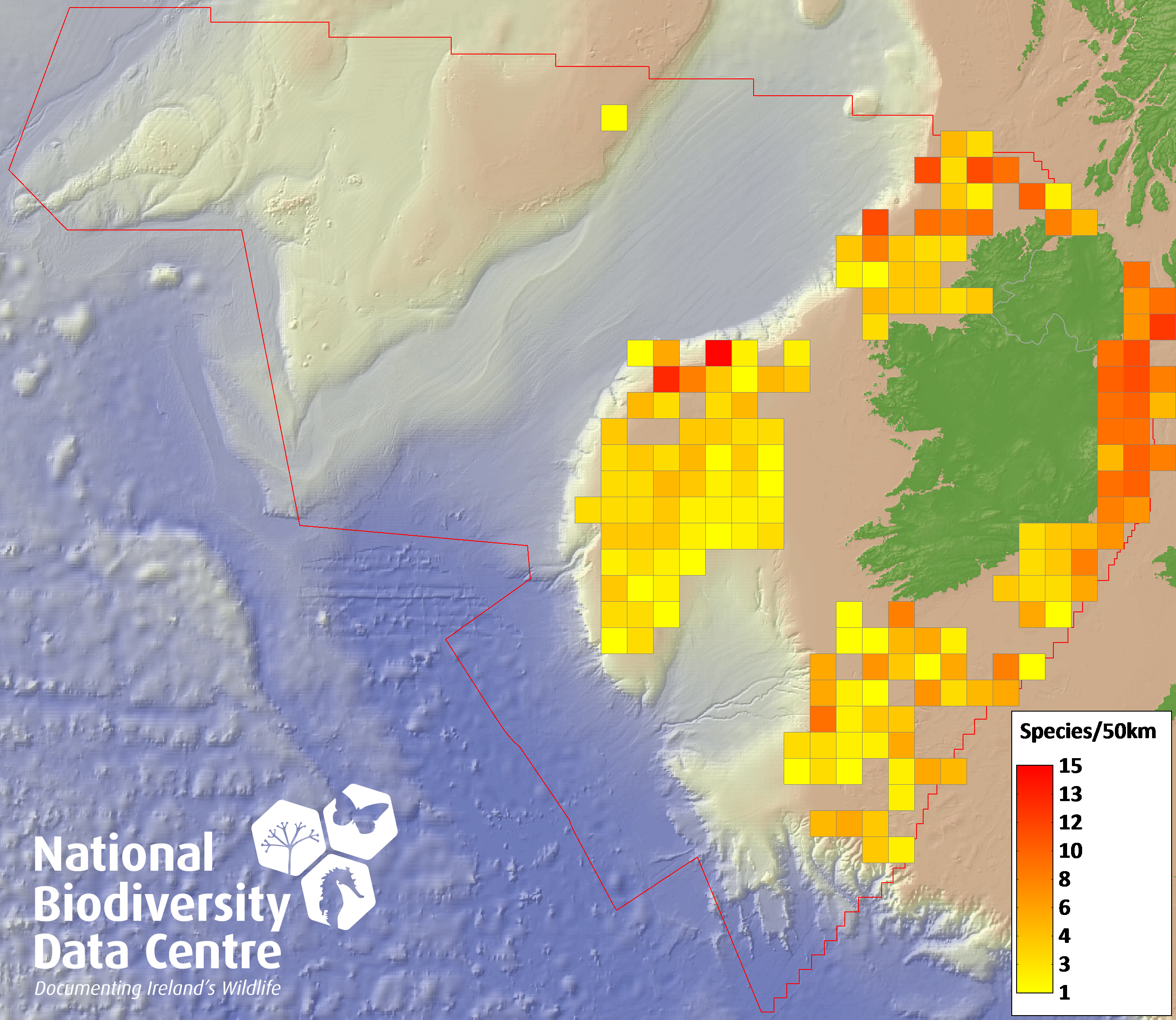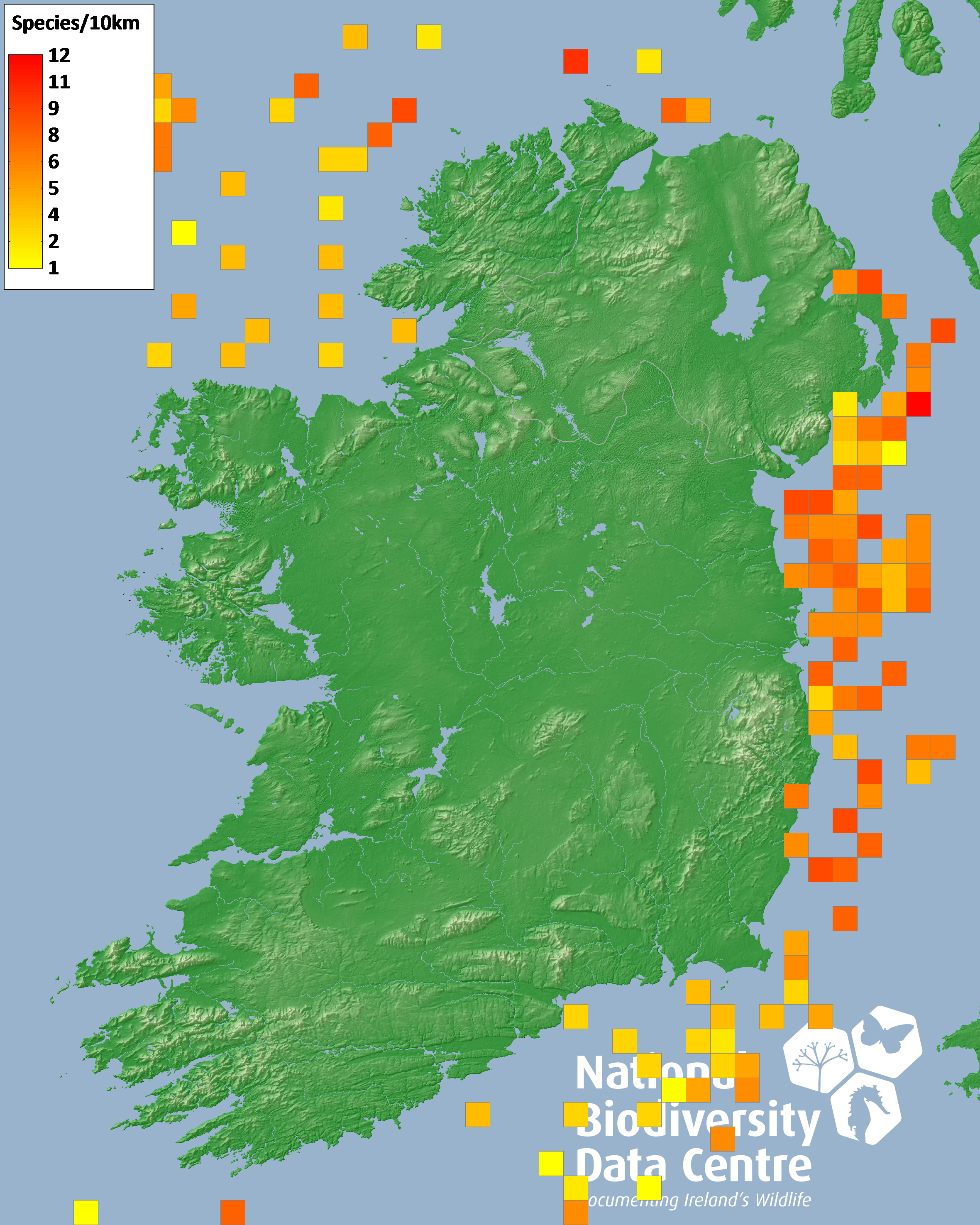 Distribution of the number of species recorded within each 10km grid square (ITM).Marine Map - 50Km