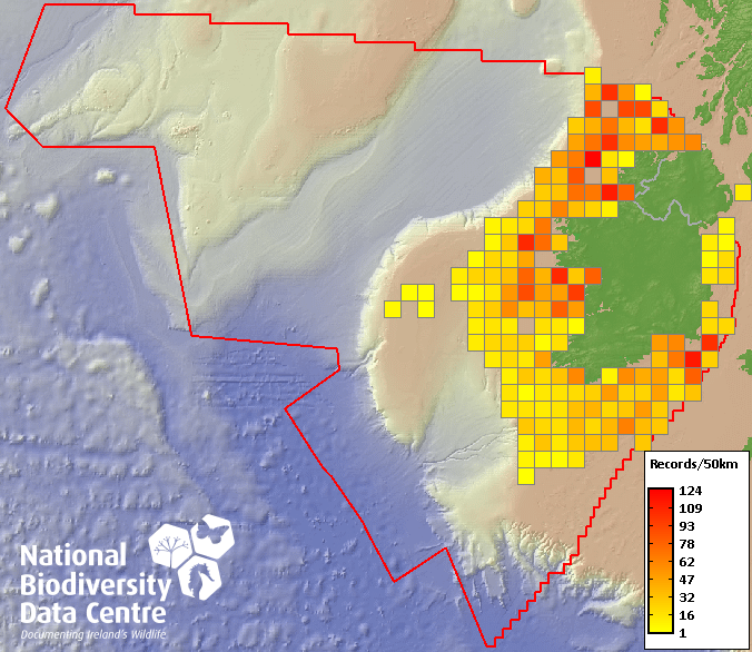 Distribution of the number of records within each 10km grid square (ITM).Marine Map - 50Km