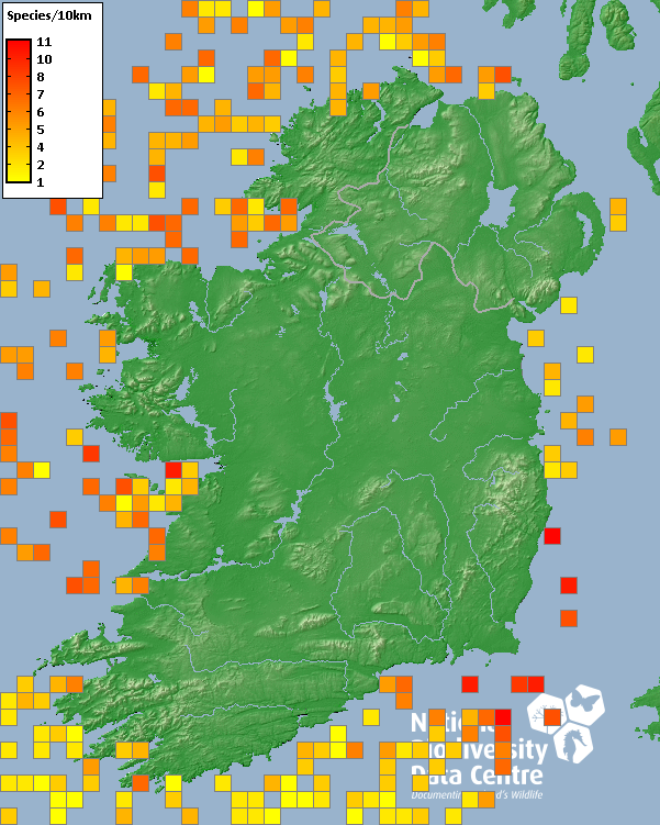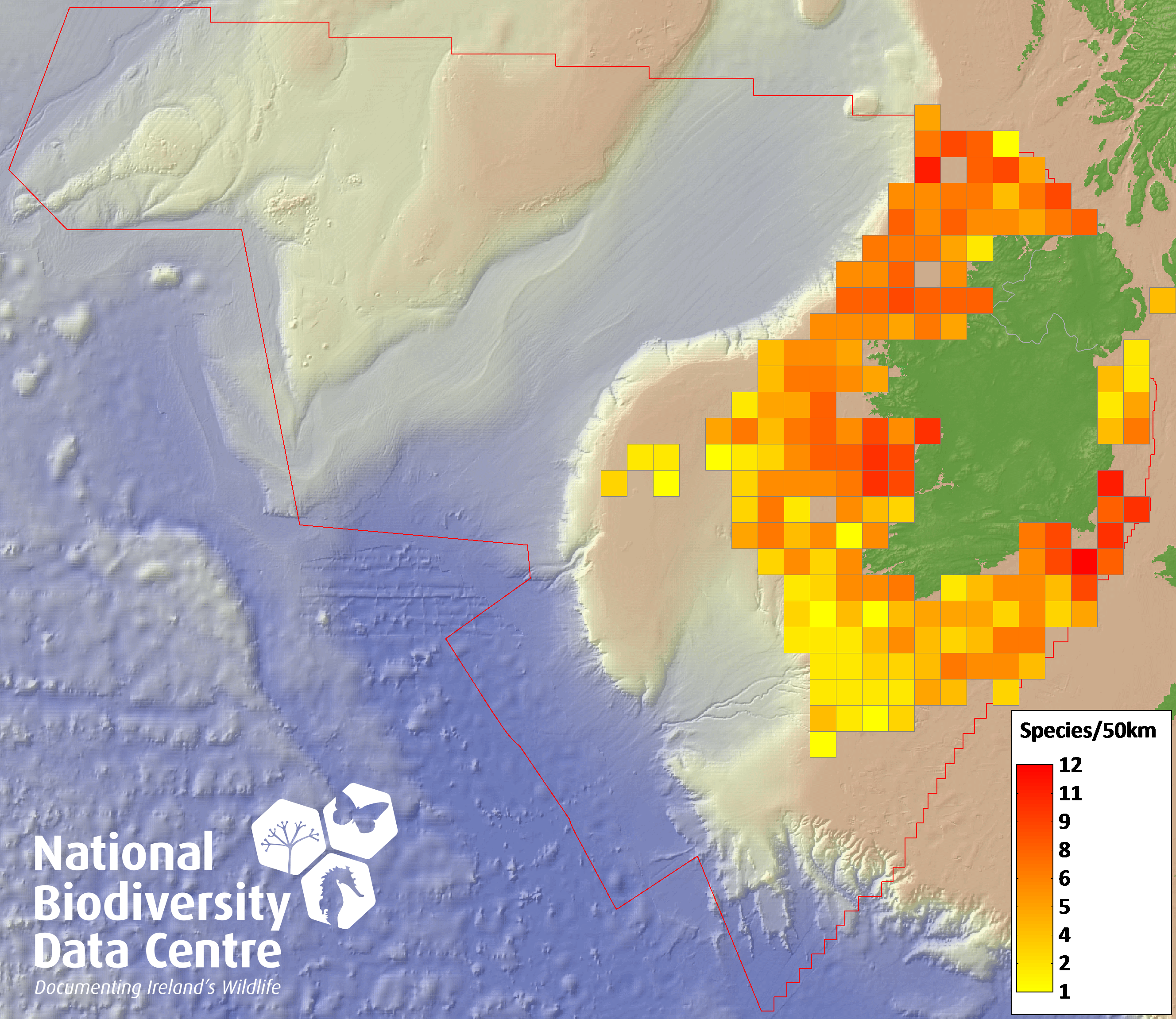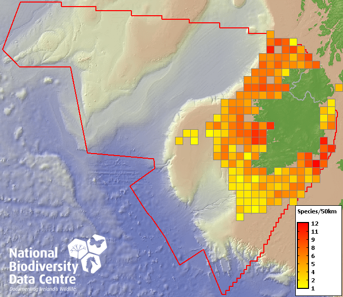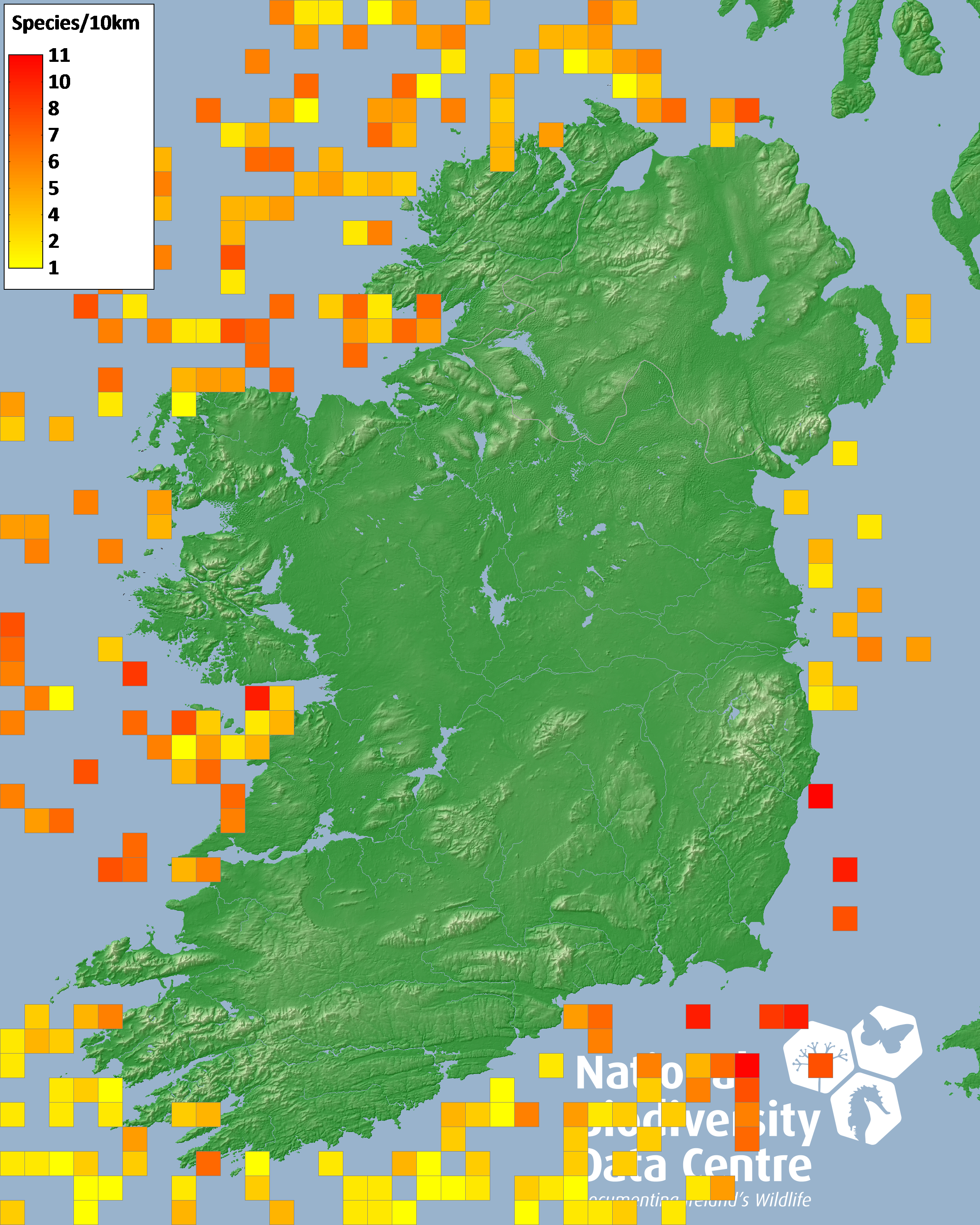 Distribution of the number of species recorded within each 10km grid square (ITM).Marine Map - 50Km