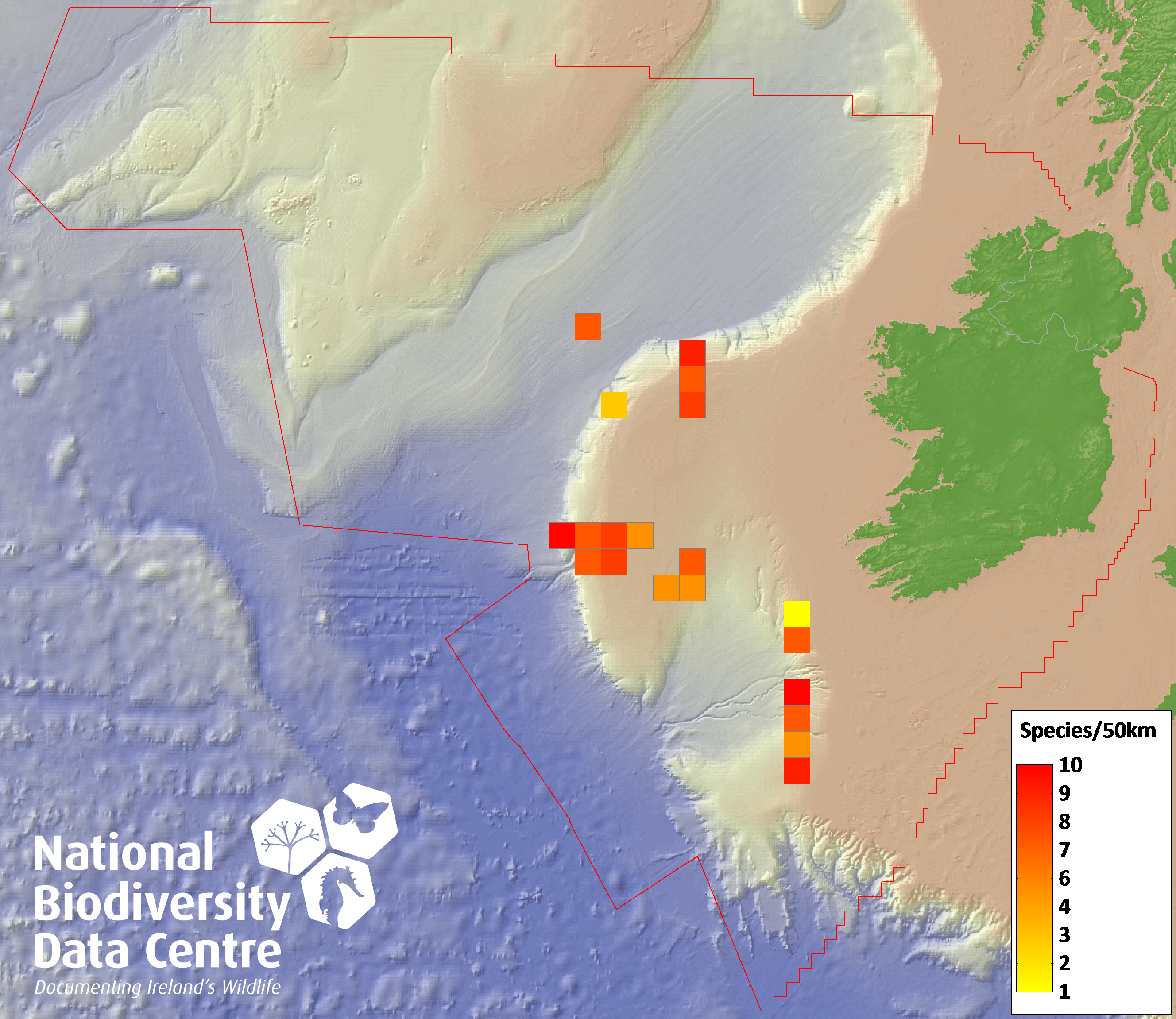 Distribution of the number of species recorded within each 10km grid square (ITM).Marine Map - 50Km