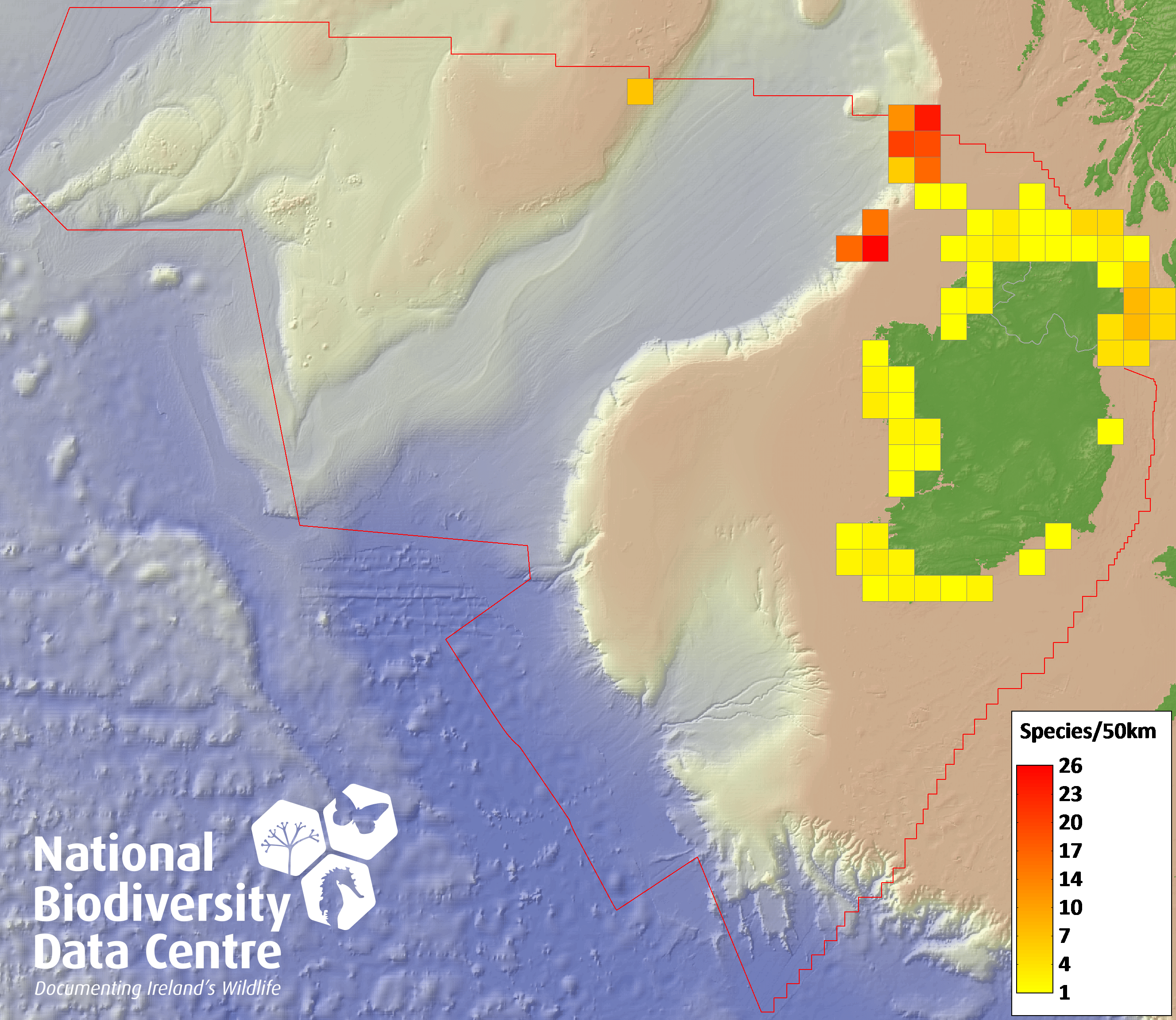 Distribution of the number of species recorded within each 10km grid square (ITM).Marine Map - 50Km