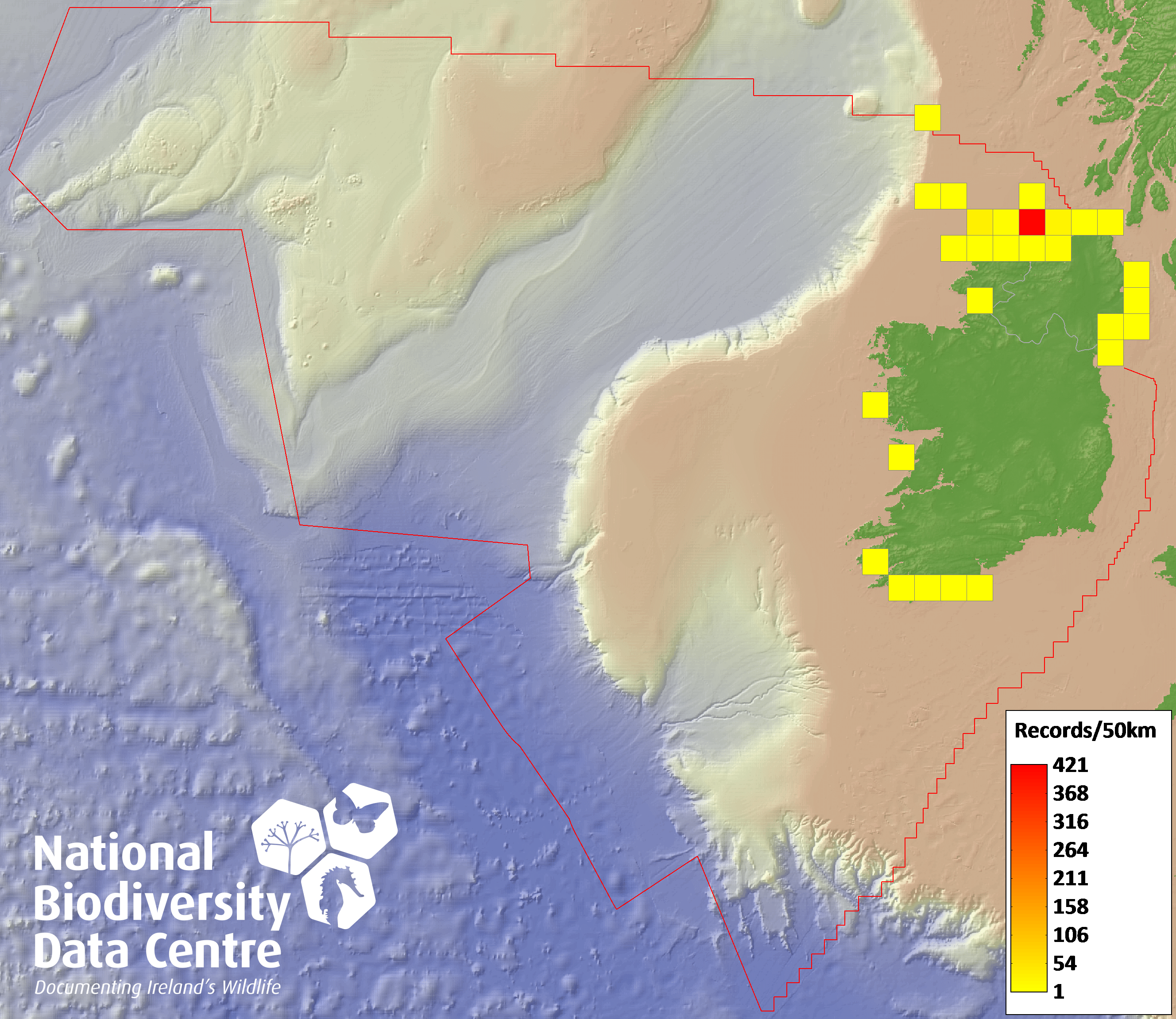 Distribution of the number of records recorded within each 10km grid square (ITM).Marine Map - 50km