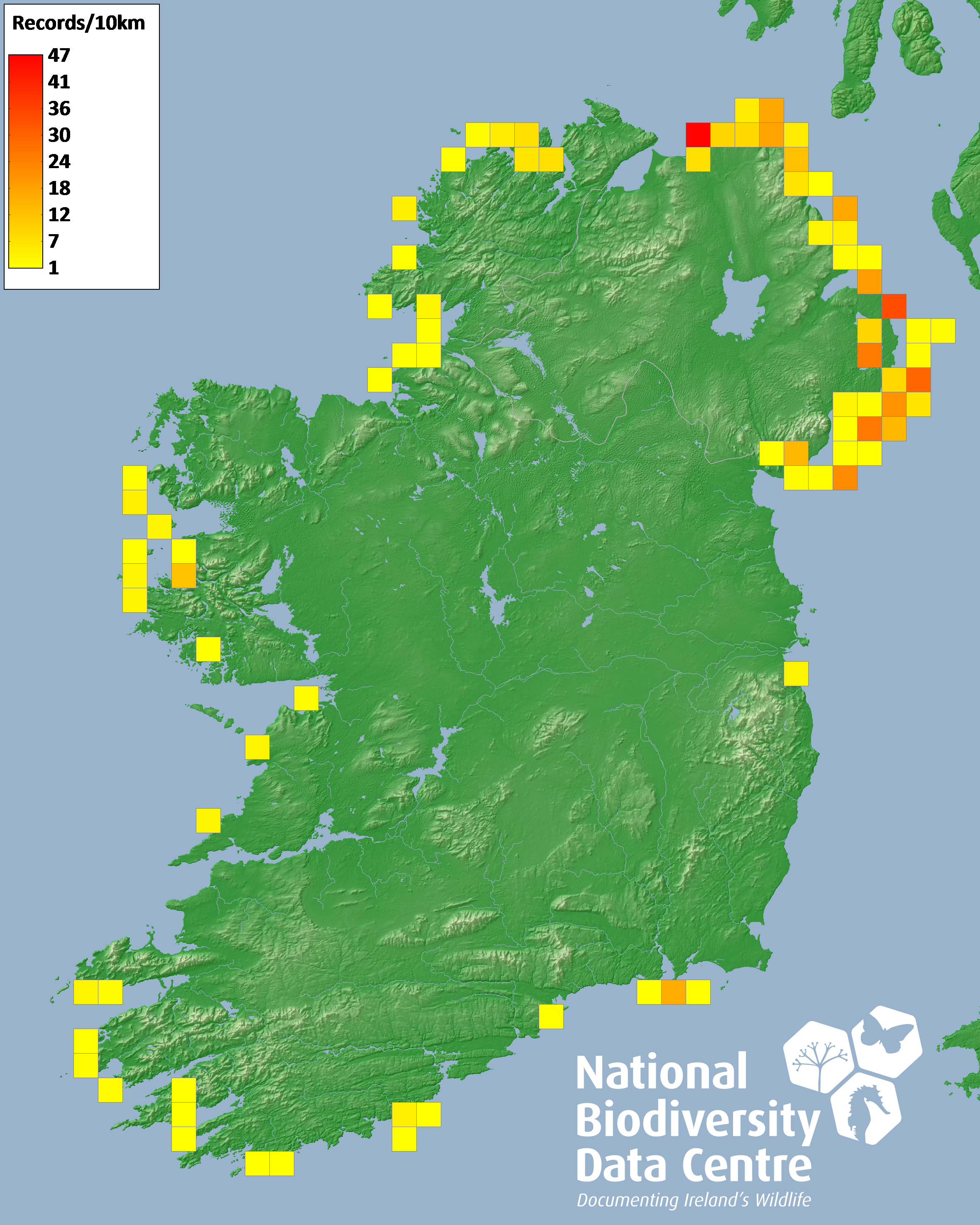 Distribution of the number of records recorded within each 10km grid square (ITM).Marine Map - 50km