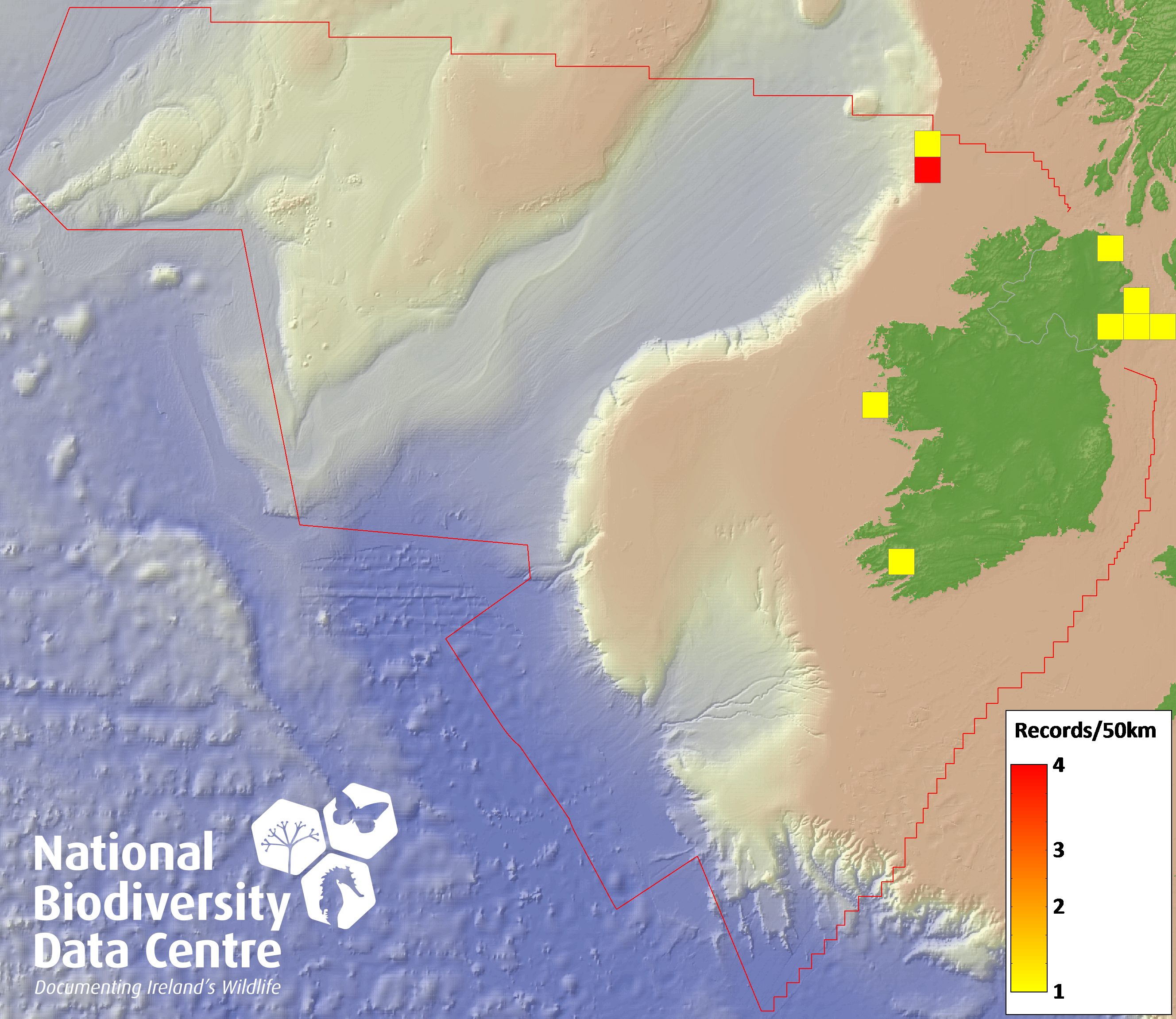 Distribution of the number of records recorded within each 10km grid square (ITM).Marine Map - 50km