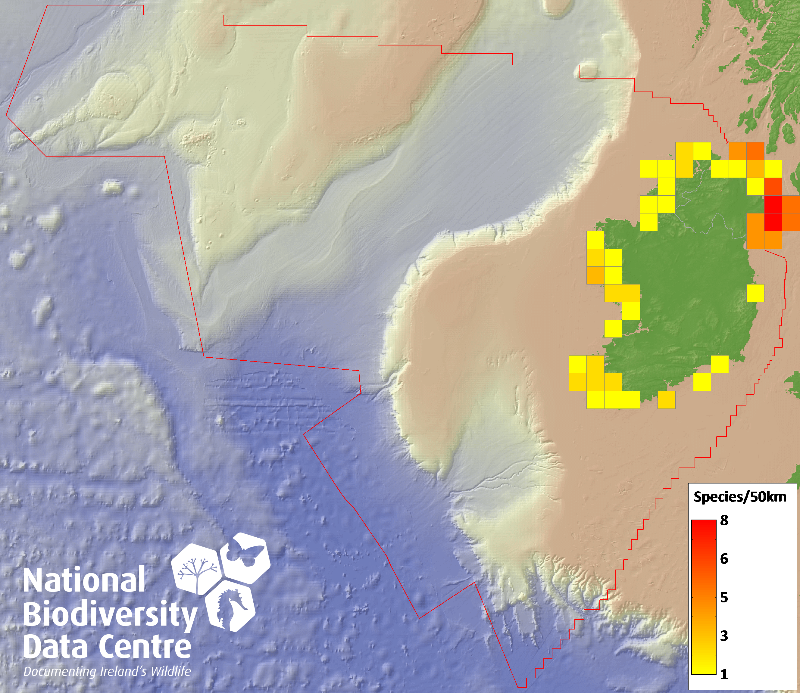 Distribution of the number of records within each 10km grid square (ITM).Marine Map - 50Km