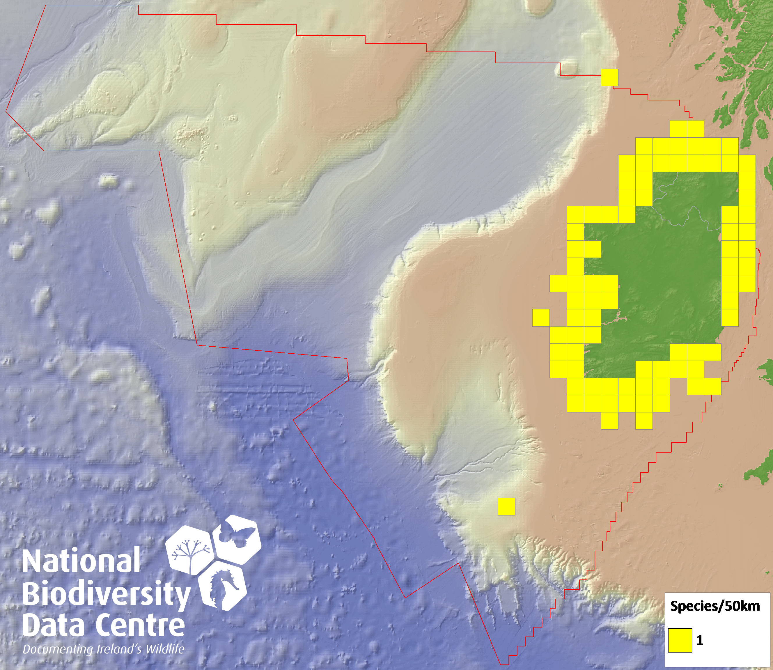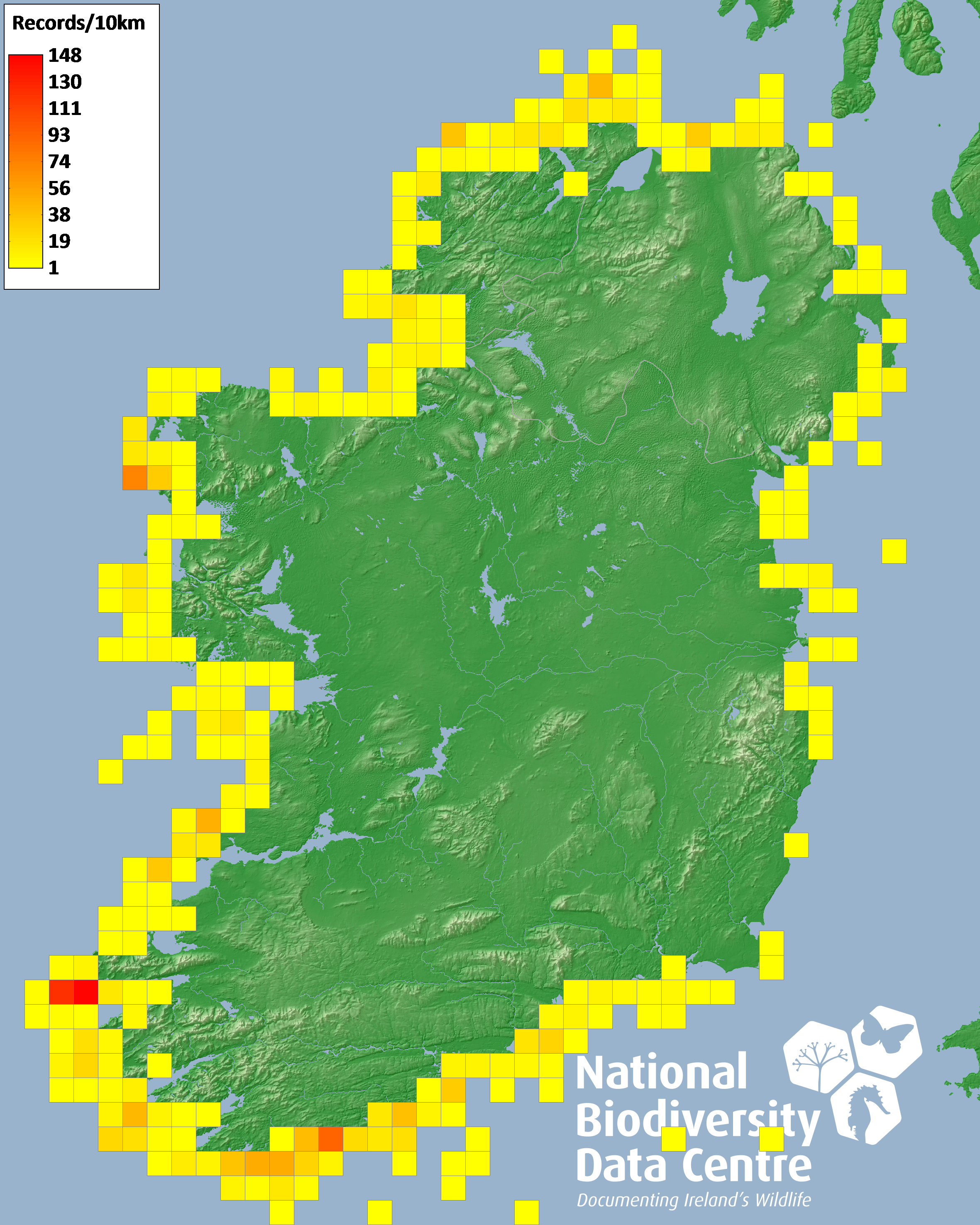 Distribution of the number of records within each 10km grid square (ITM).Marine Map - 50Km