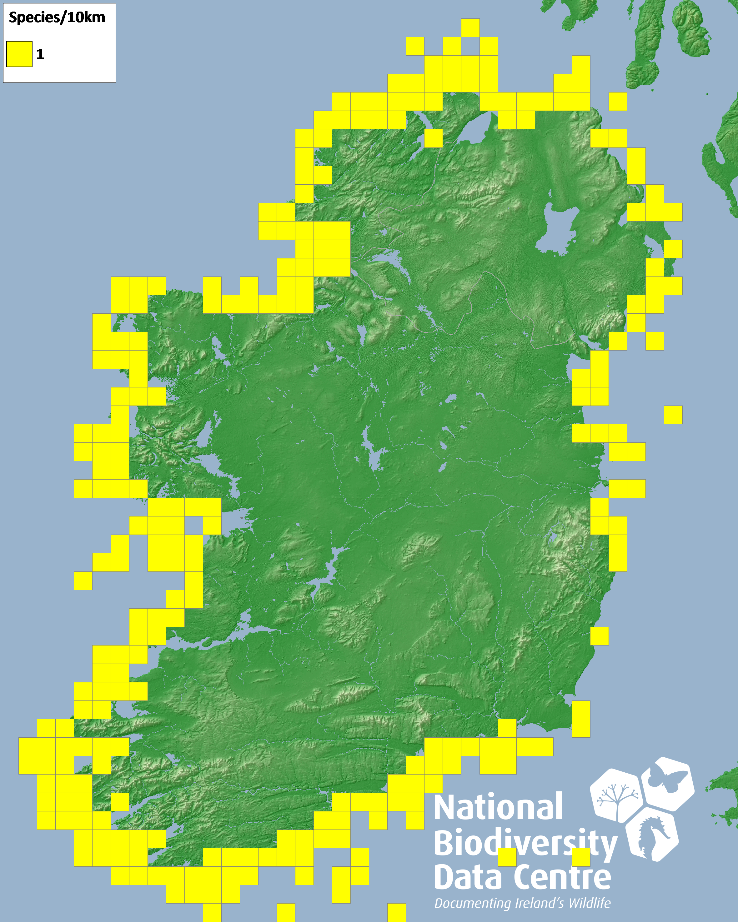 Distribution of the number of species recorded within each 10km grid square (ITM).Marine Map - 50Km