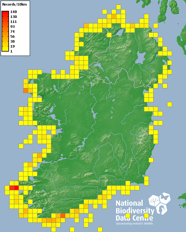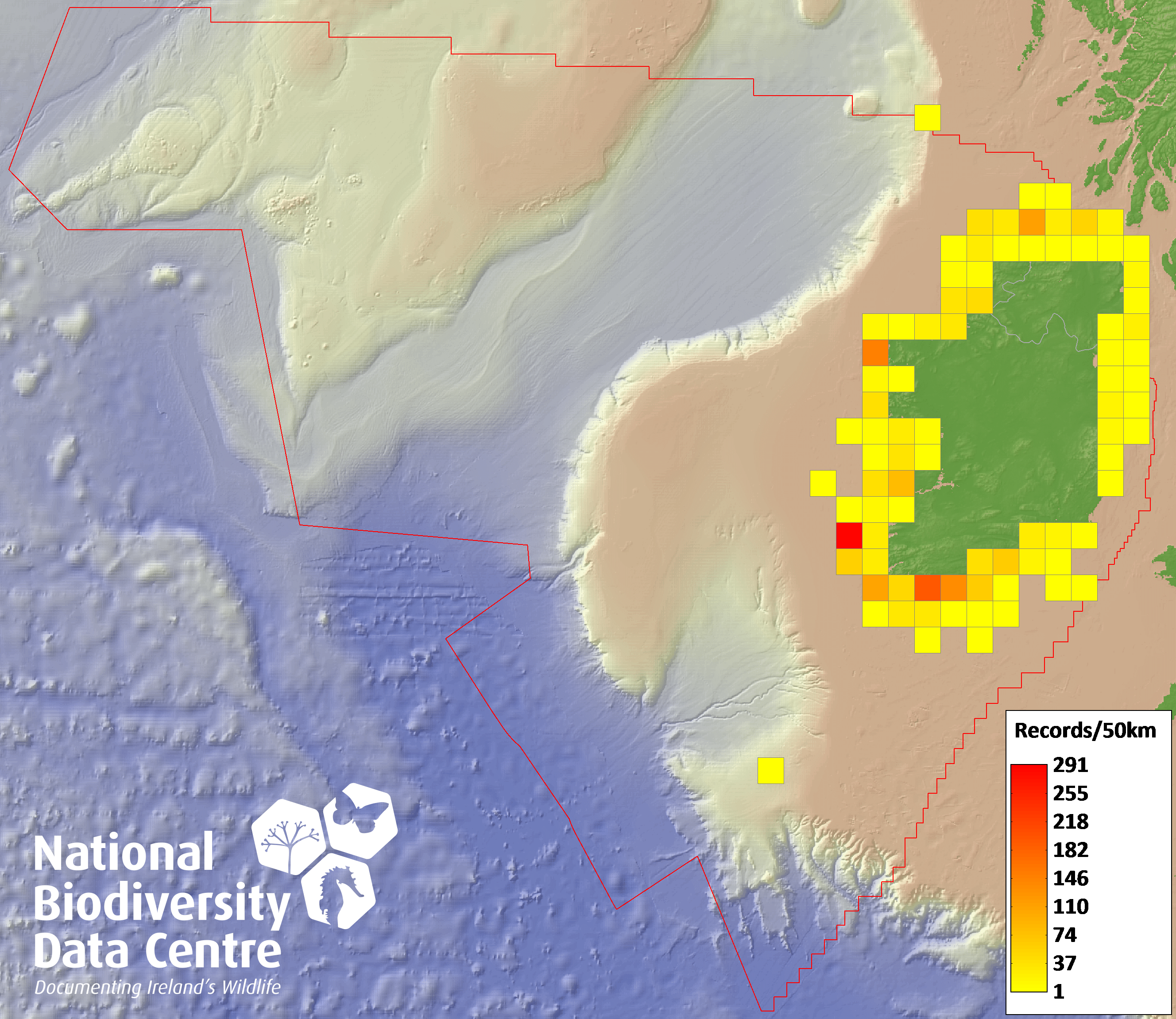 Distribution of the number of records recorded within each 10km grid square (ITM).Marine Map - 50km