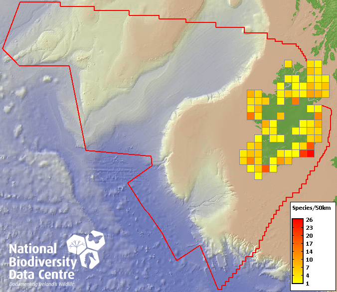 Distribution of the number of species recorded within each 10km grid square (ITM).Marine Map - 50Km