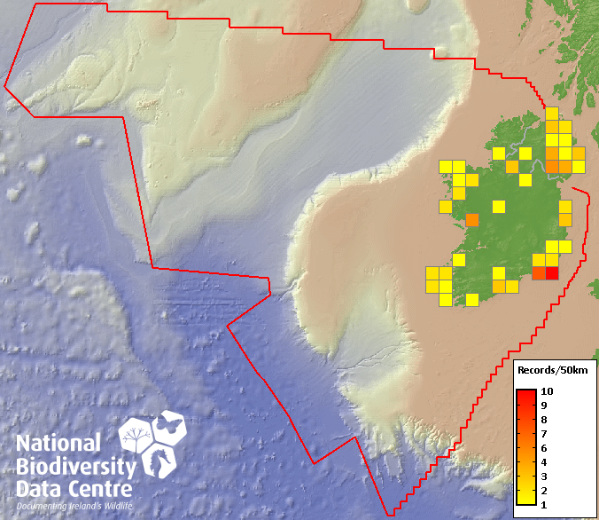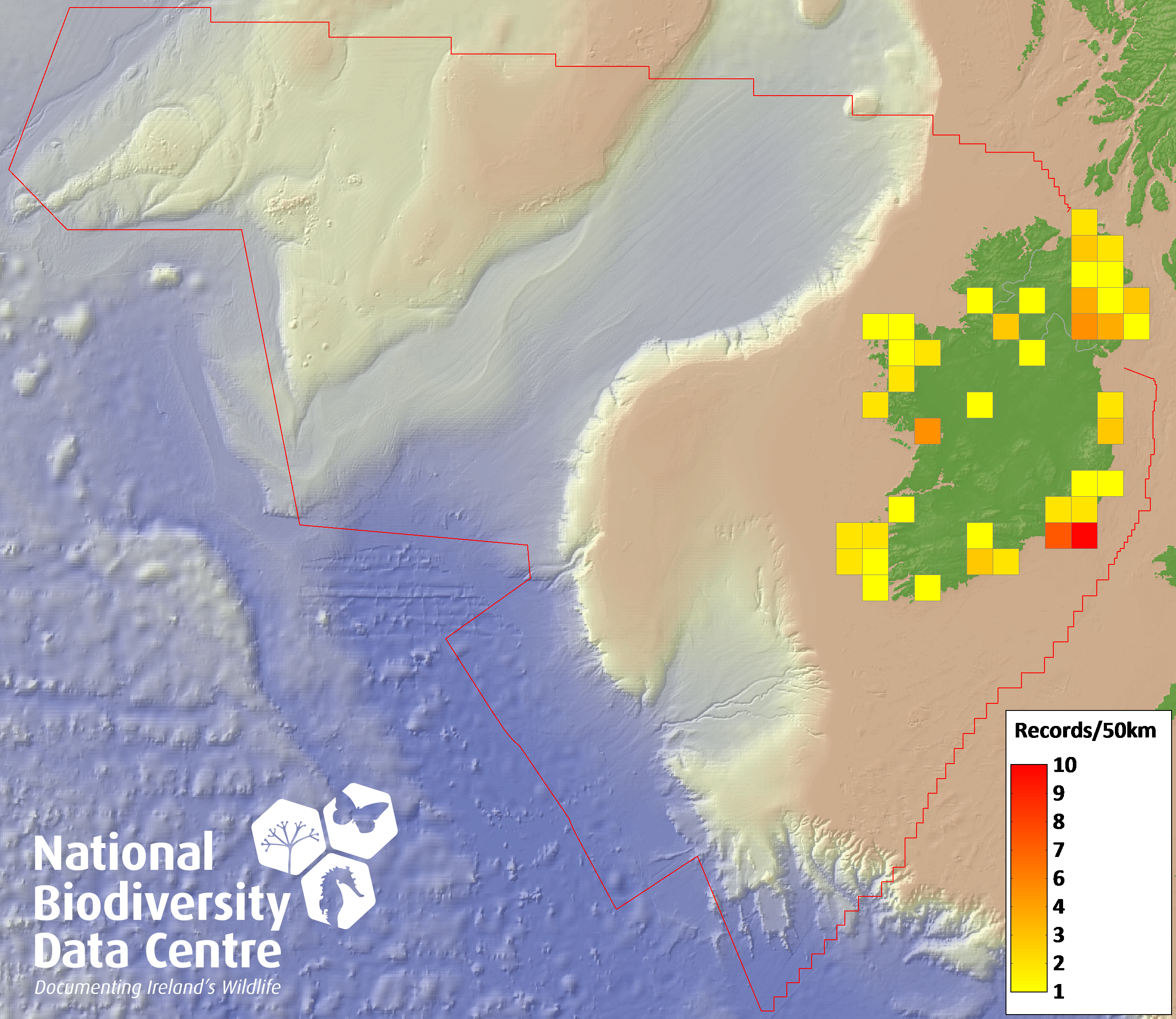 Distribution of the number of records recorded within each 10km grid square (ITM).Marine Map - 50km