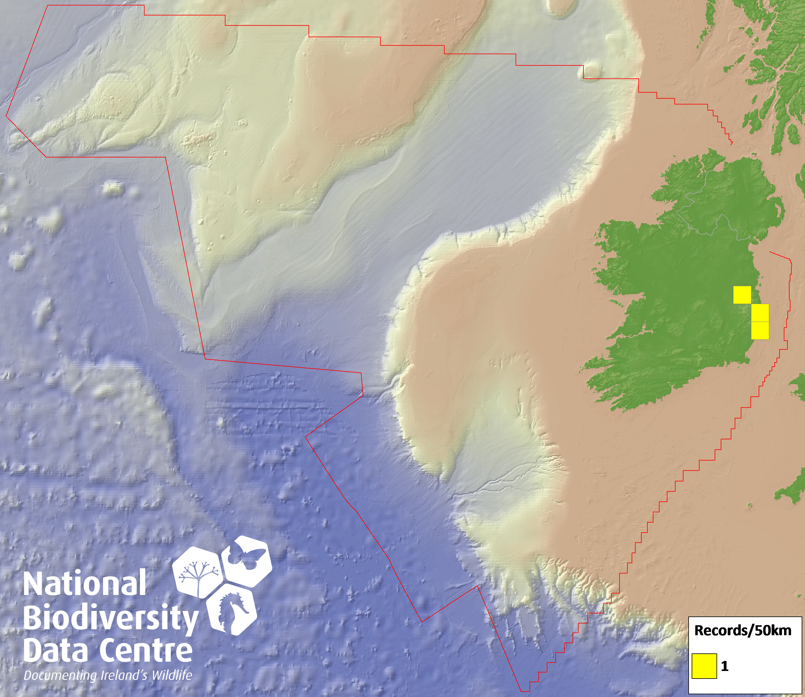 Distribution of the number of records recorded within each 10km grid square (ITM).Marine Map - 50km