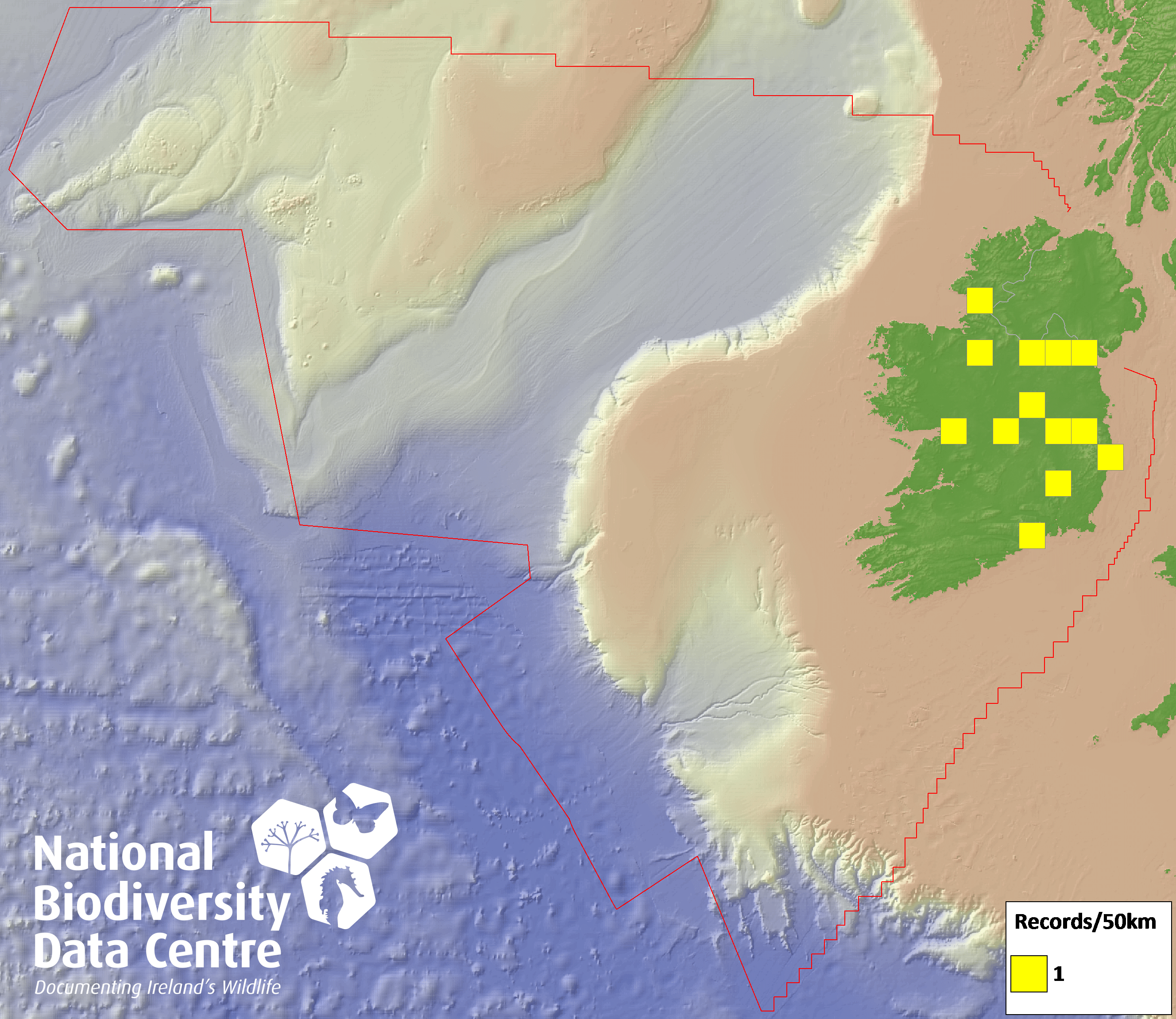 Distribution of the number of records recorded within each 10km grid square (ITM).Marine Map - 50km