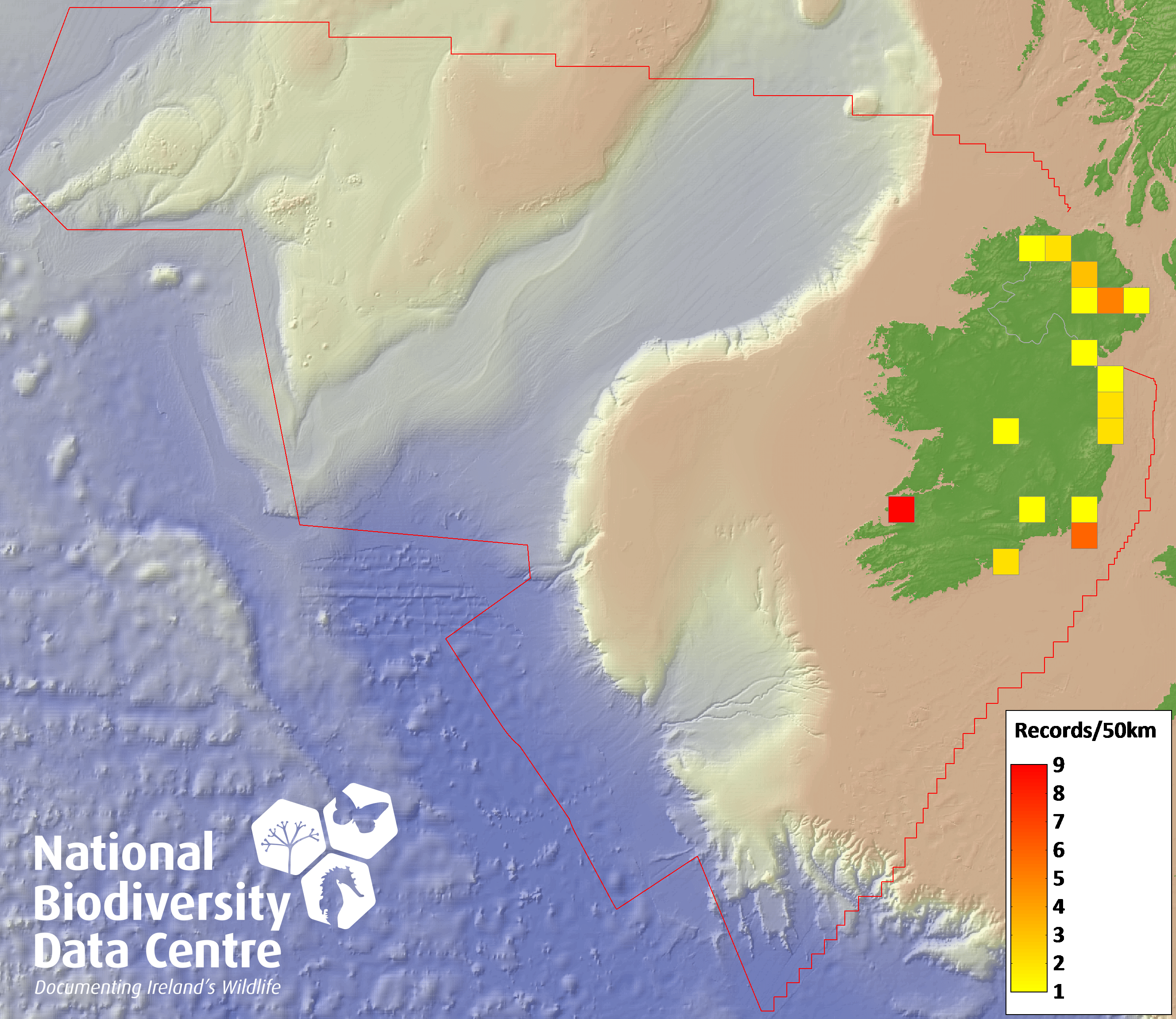Distribution of the number of records recorded within each 10km grid square (ITM).Marine Map - 50km