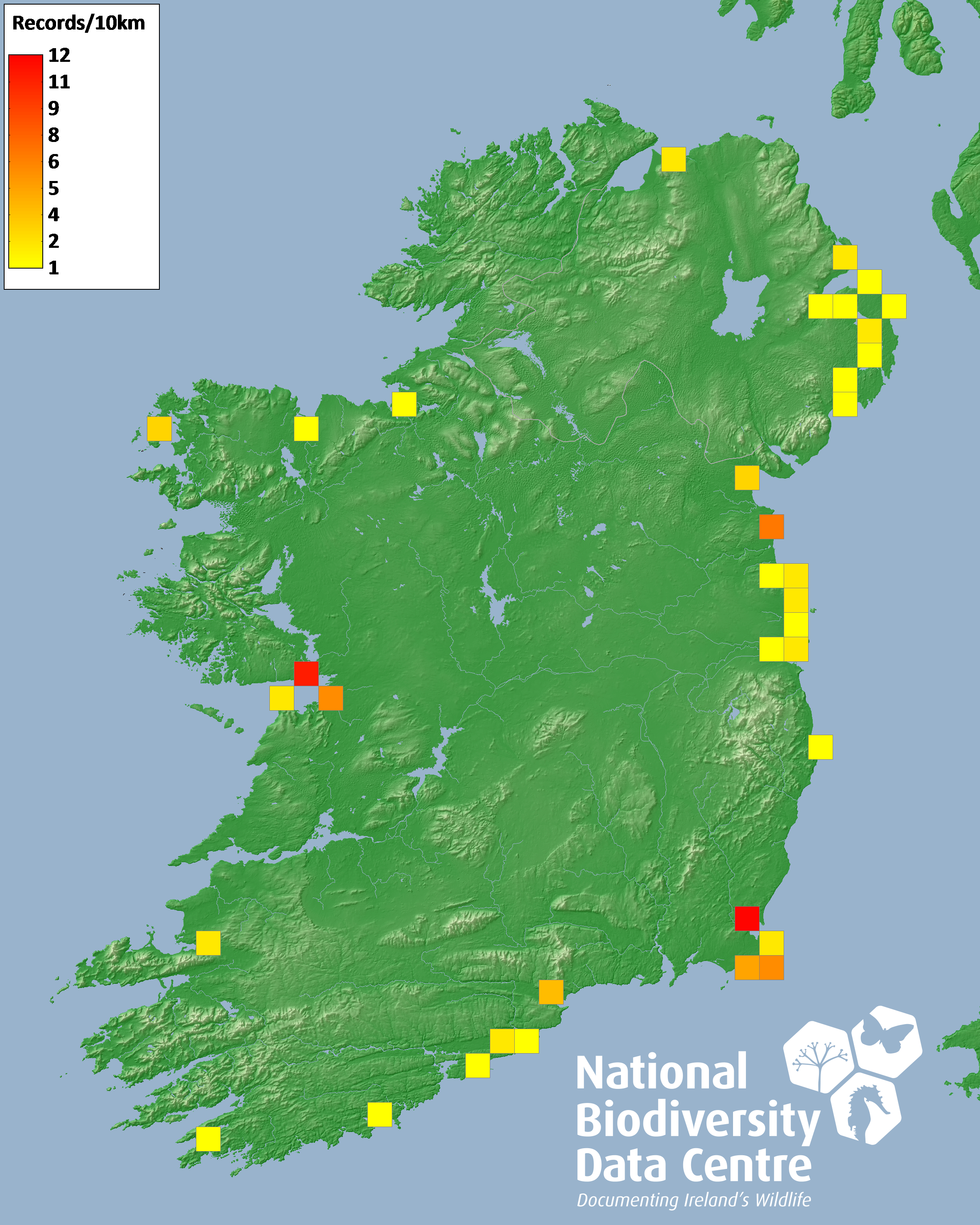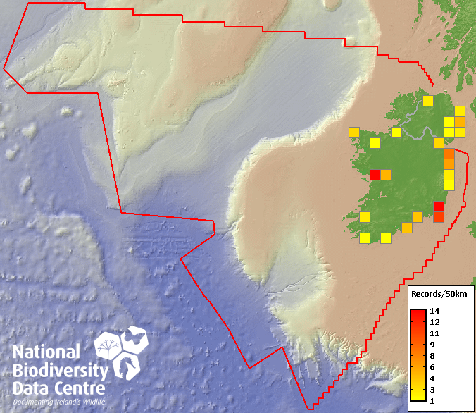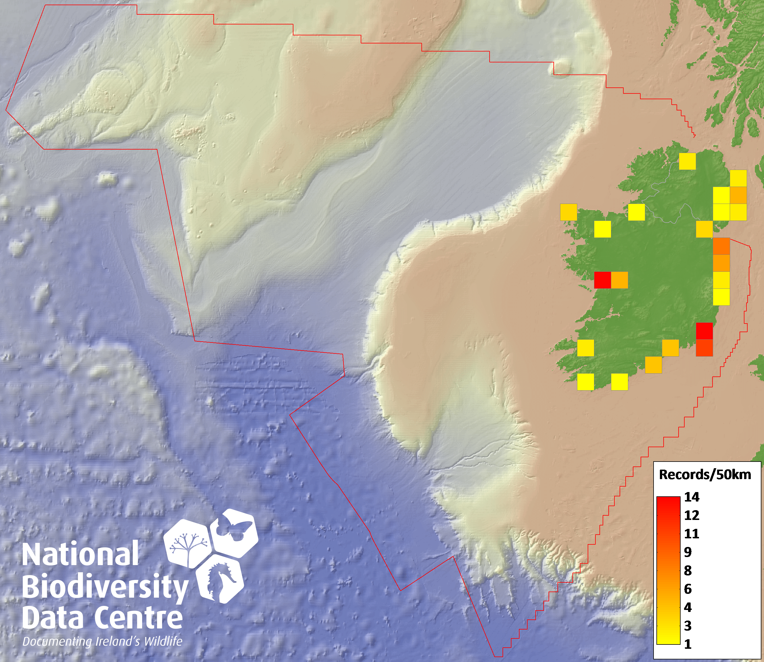Distribution of the number of records recorded within each 10km grid square (ITM).Marine Map - 50km