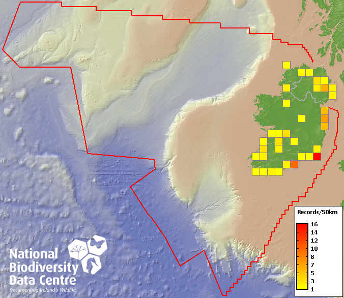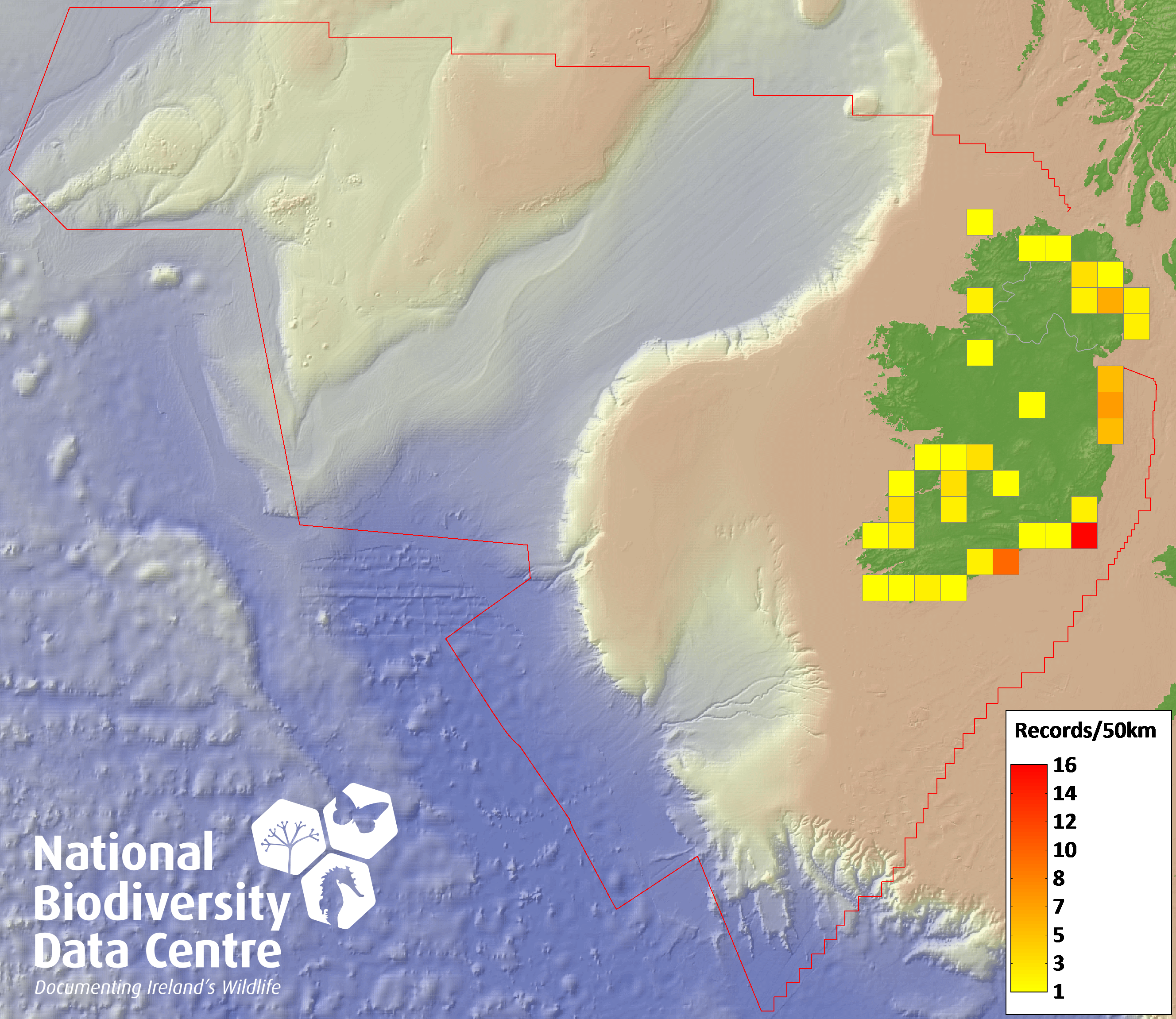 Distribution of the number of records recorded within each 10km grid square (ITM).Marine Map - 50km