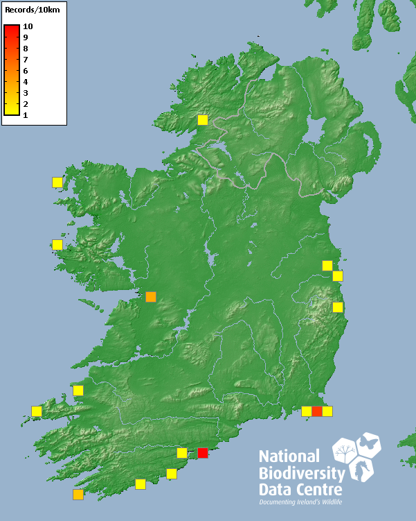 Distribution of the number of records recorded within each 10km grid square (ITM).Marine Map - 50km