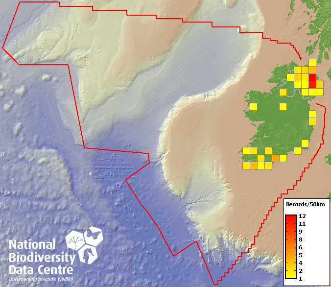 Distribution of the number of records recorded within each 10km grid square (ITM).Marine Map - 50km