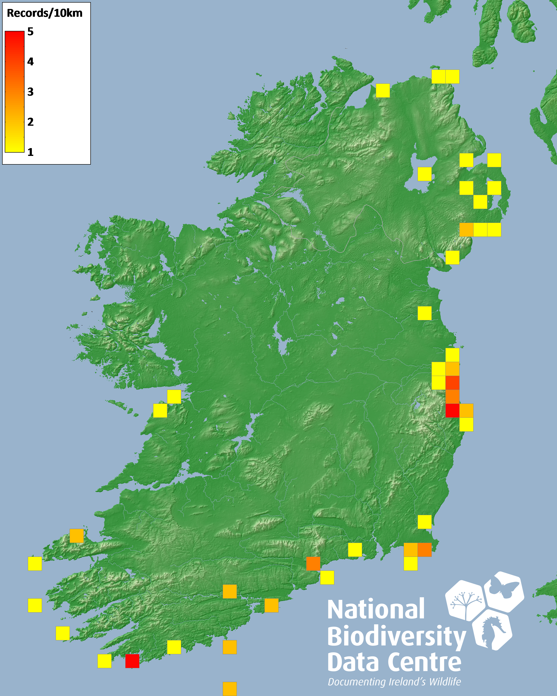 Distribution of the number of records recorded within each 10km grid square (ITM).Marine Map - 50km