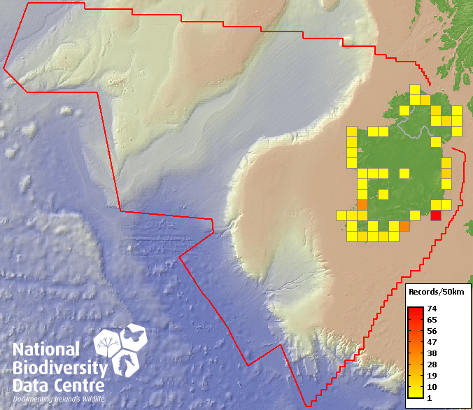 Distribution of the number of records recorded within each 10km grid square (ITM).Marine Map - 50km