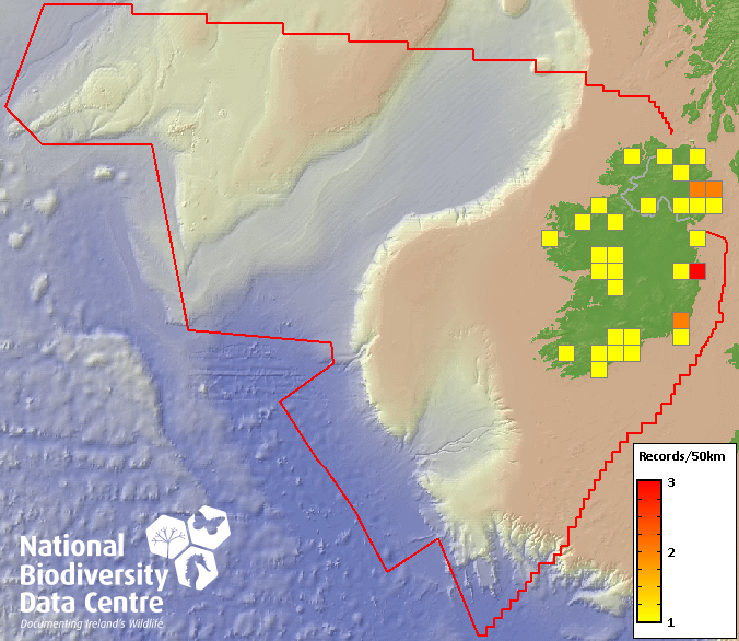 Distribution of the number of records recorded within each 10km grid square (ITM).Marine Map - 50km