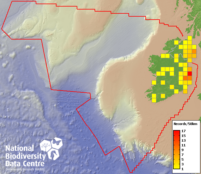 Distribution of the number of records recorded within each 10km grid square (ITM).Marine Map - 50km