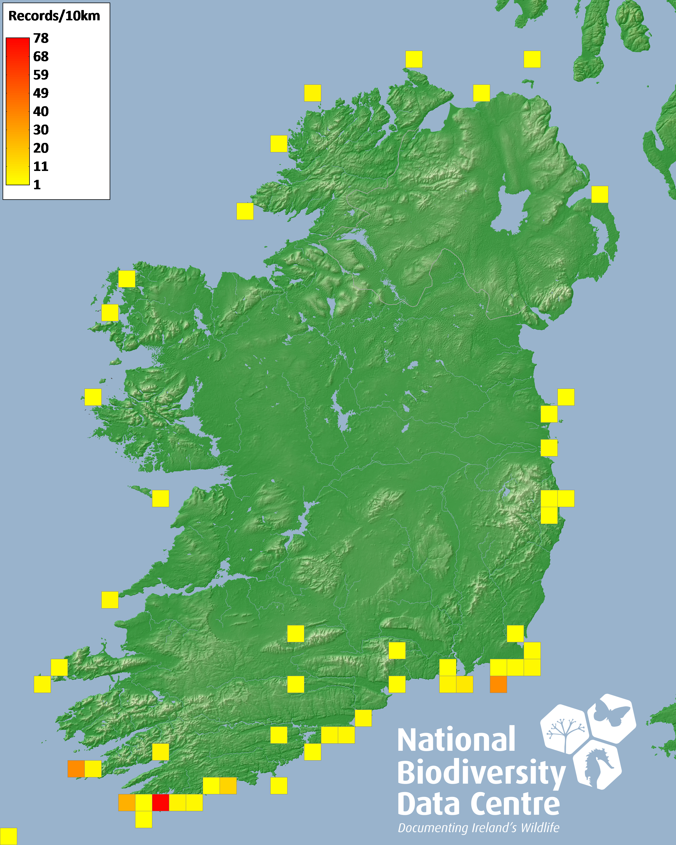 Distribution of the number of records recorded within each 10km grid square (ITM).Marine Map - 50km