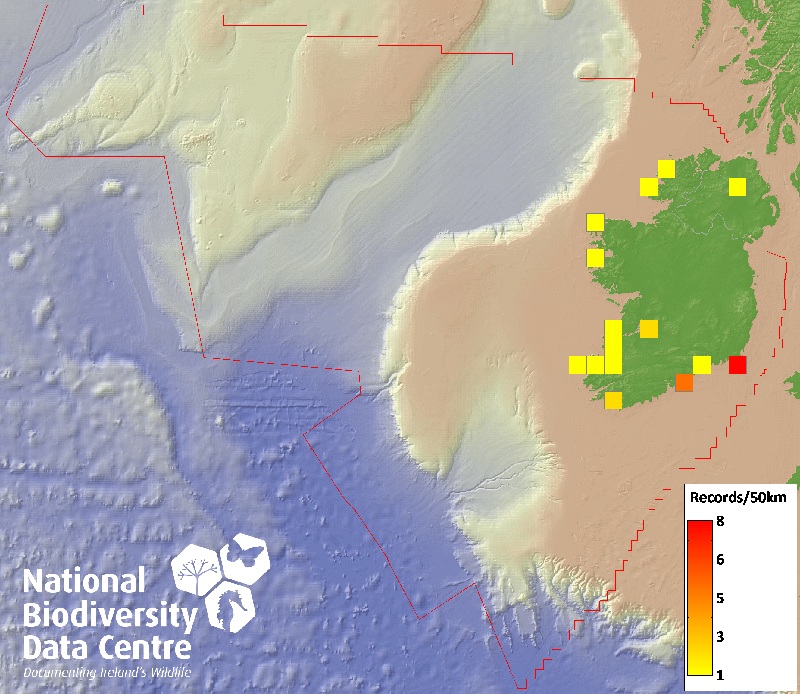 Distribution of the number of records recorded within each 10km grid square (ITM).Marine Map - 50km
