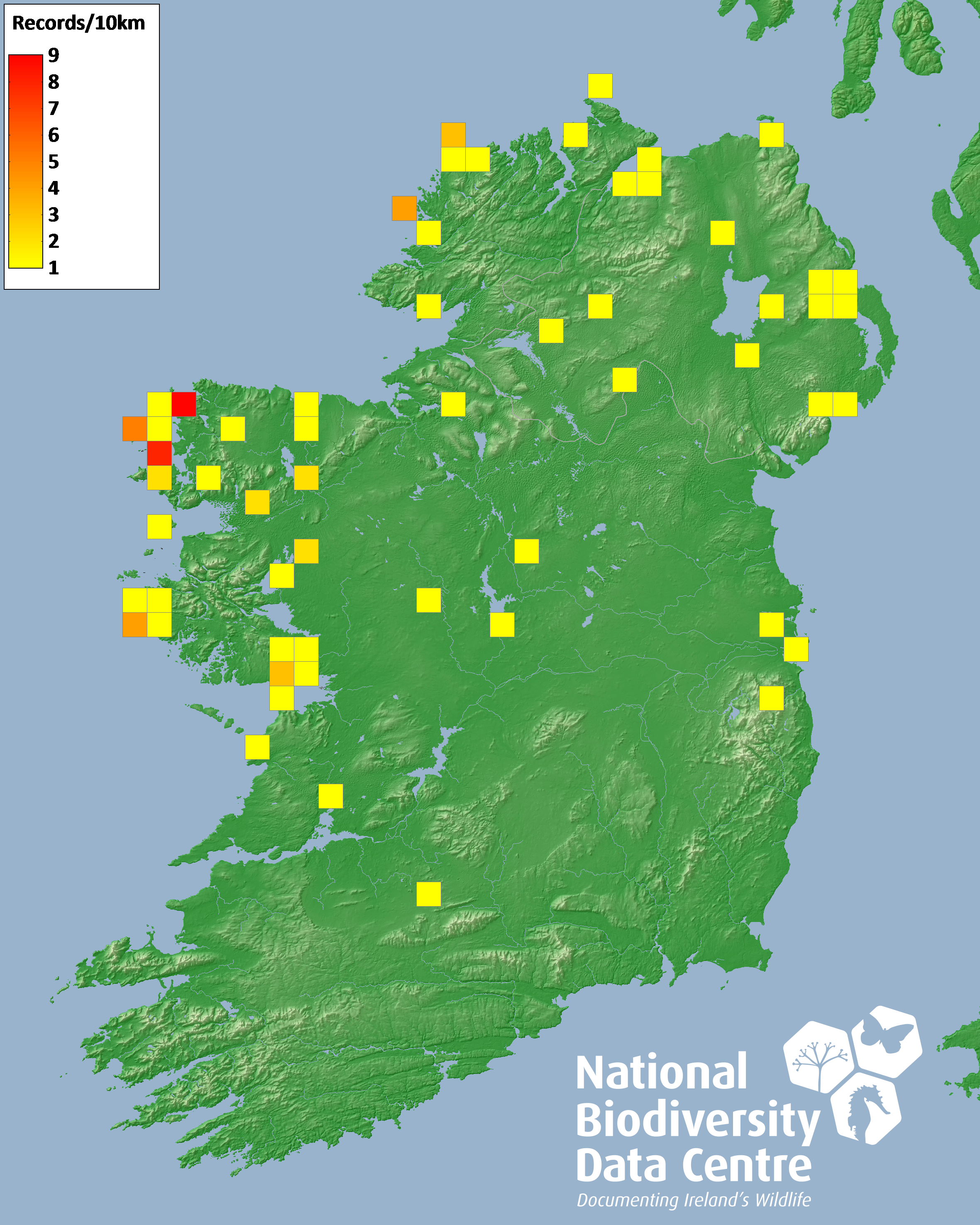Distribution of the number of records recorded within each 10km grid square (ITM).Marine Map - 50km