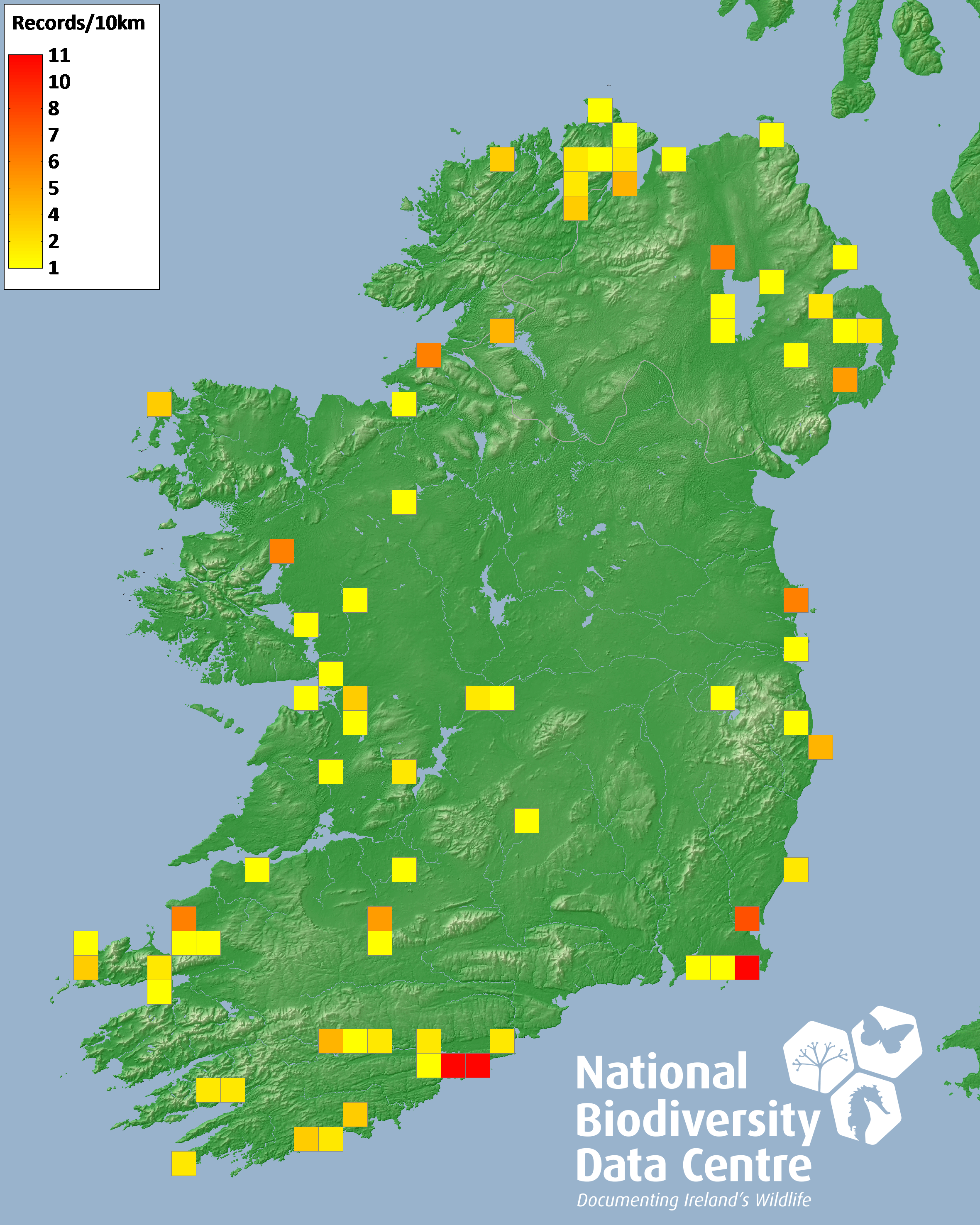Distribution of the number of records recorded within each 10km grid square (ITM).Marine Map - 50km