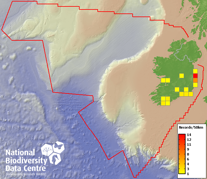Distribution of the number of records recorded within each 10km grid square (ITM).Marine Map - 50km