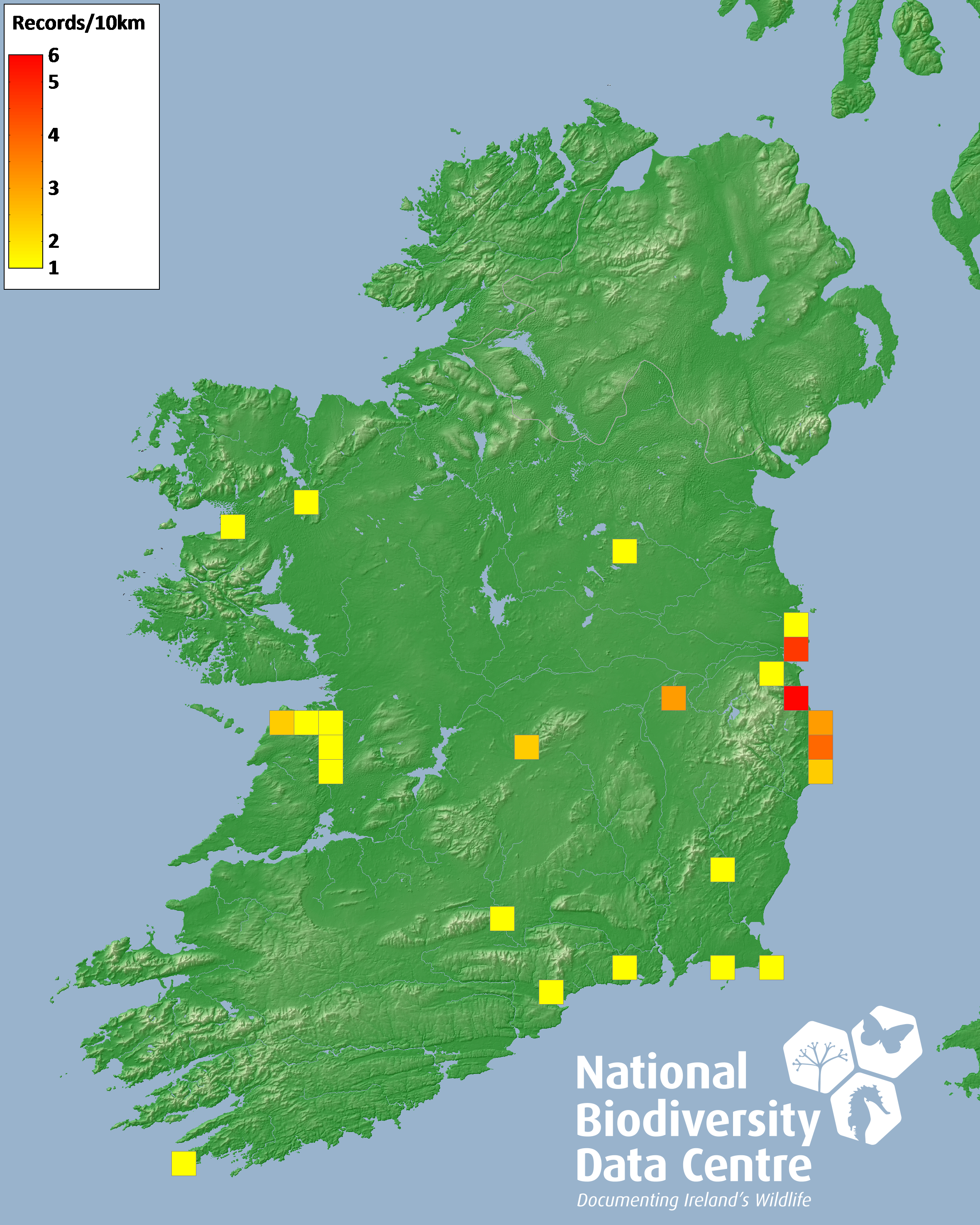 Distribution of the number of records recorded within each 10km grid square (ITM).Marine Map - 50km