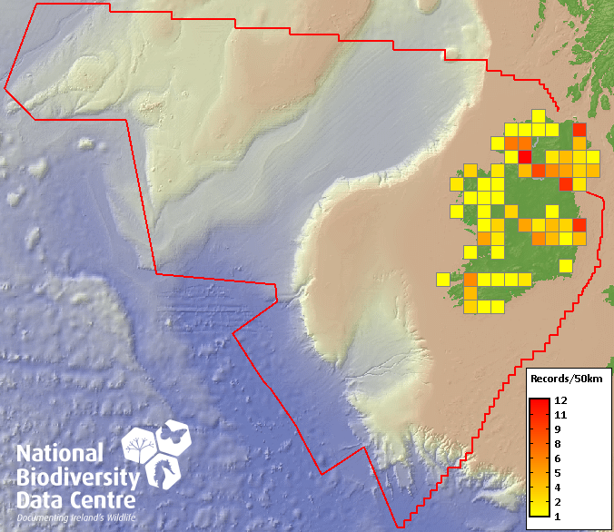 Distribution of the number of records recorded within each 10km grid square (ITM).Marine Map - 50km