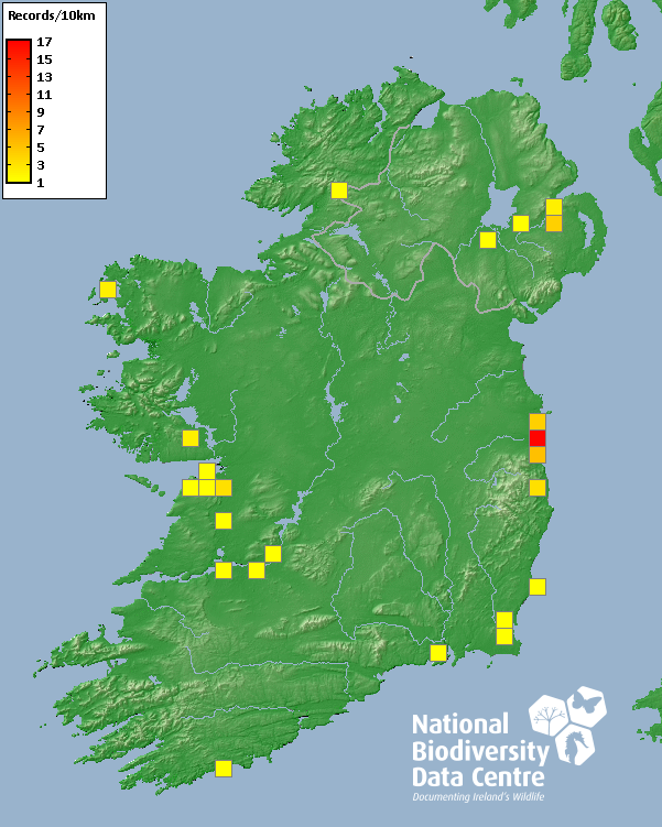 Distribution of the number of records recorded within each 10km grid square (ITM).Marine Map - 50km