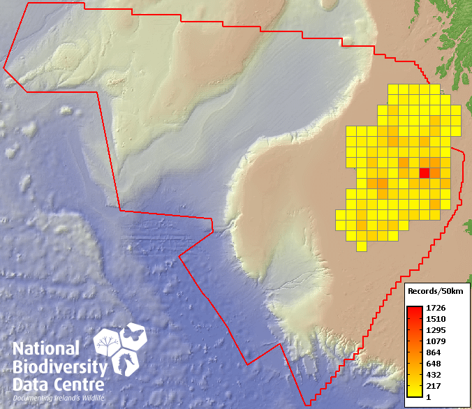 Distribution of the number of records within each 10km grid square (ITM).Marine Map - 50Km