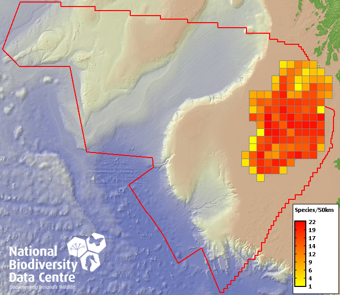 Distribution of the number of species recorded within each 10km grid square (ITM).Marine Map - 50Km