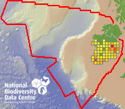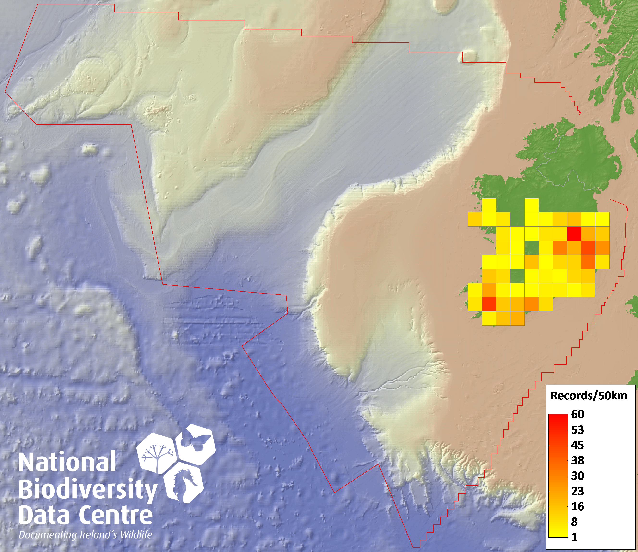 Distribution of the number of records recorded within each 10km grid square (ITM).Marine Map - 50km