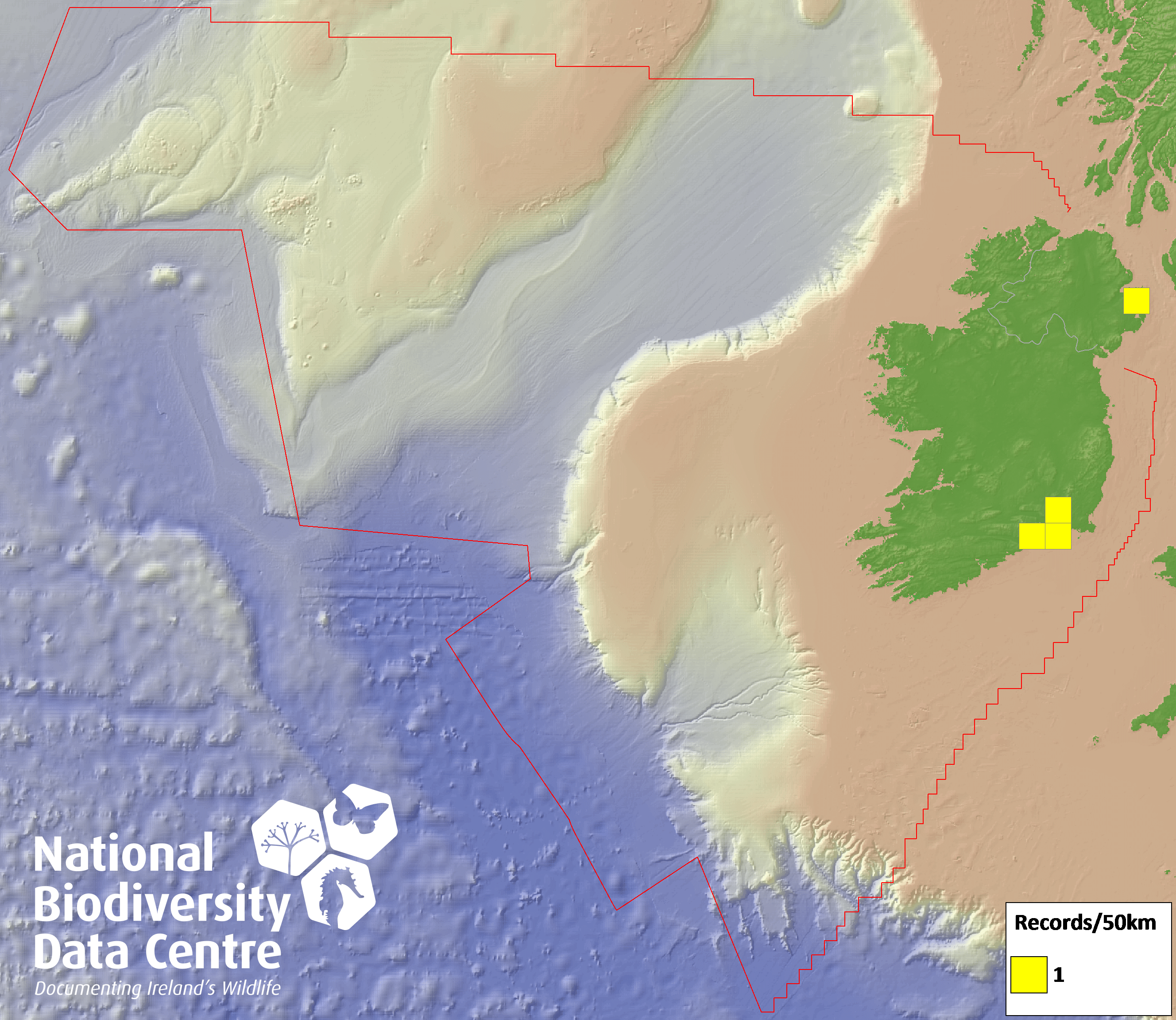 Distribution of the number of records recorded within each 10km grid square (ITM).Marine Map - 50km