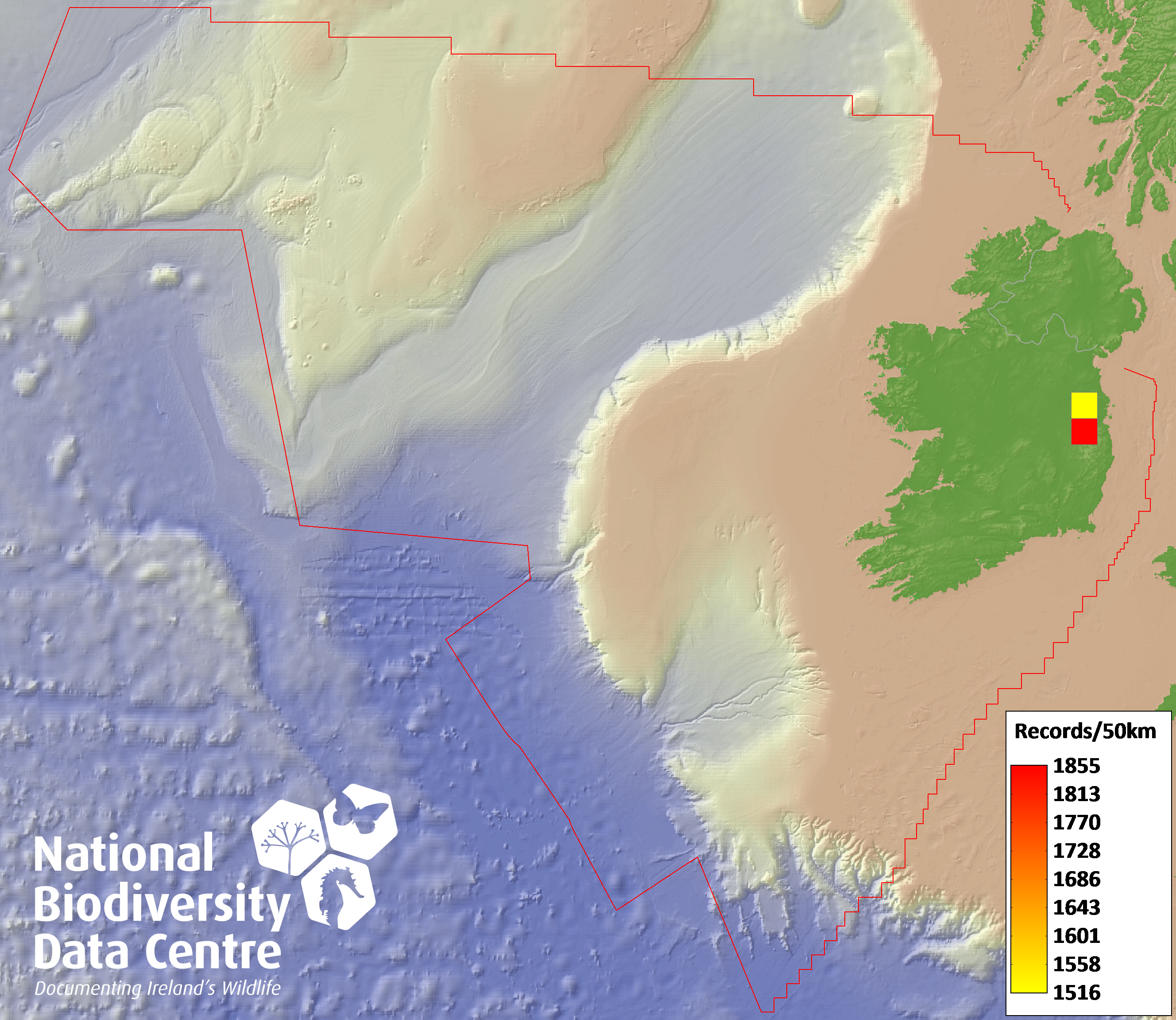 Distribution of the number of records within each 10km grid square (ITM).Marine Map - 50Km