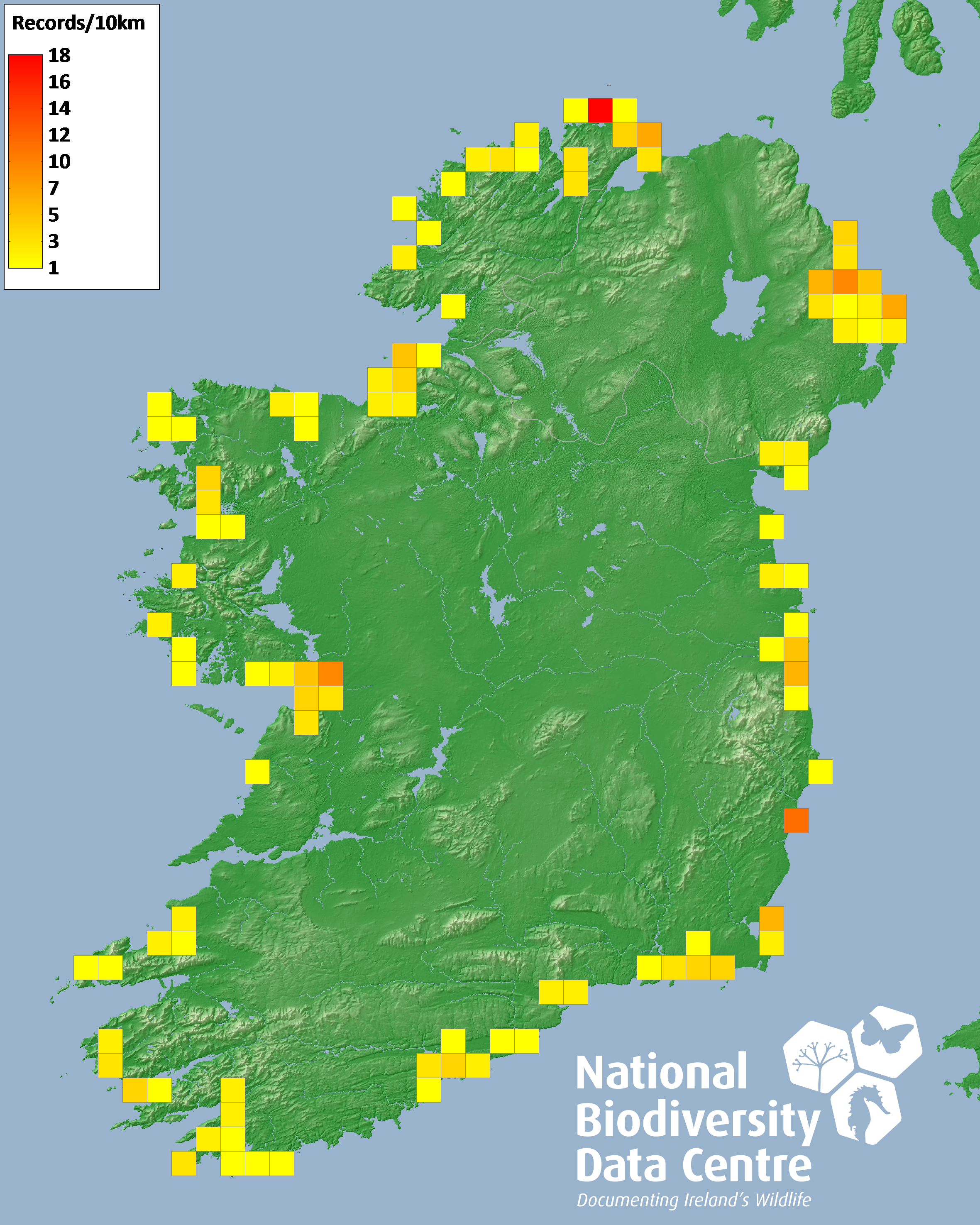 Distribution of the number of records recorded within each 10km grid square (ITM).Marine Map - 50km