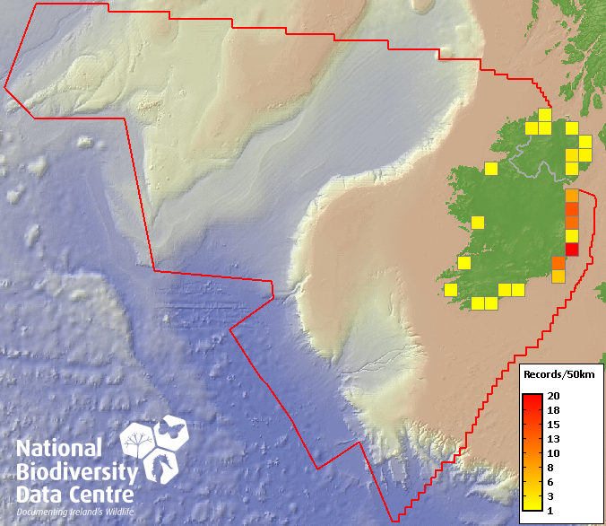 Distribution of the number of records recorded within each 10km grid square (ITM).Marine Map - 50km