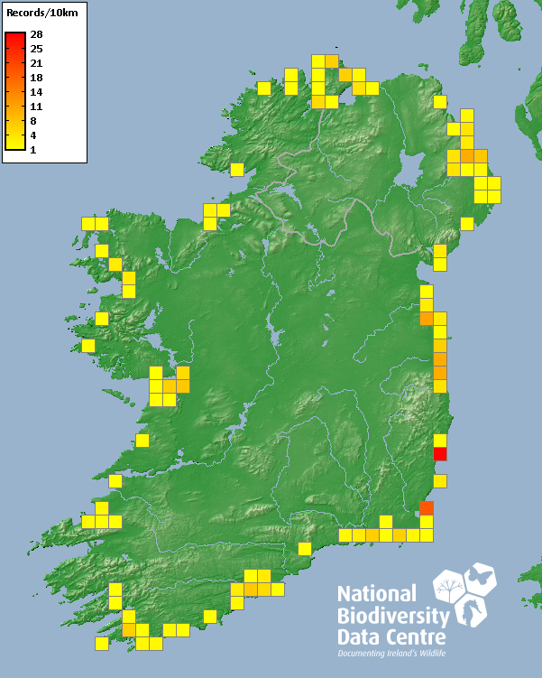 Distribution of the number of records recorded within each 10km grid square (ITM).Marine Map - 50km
