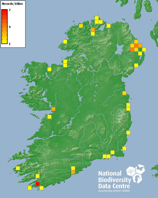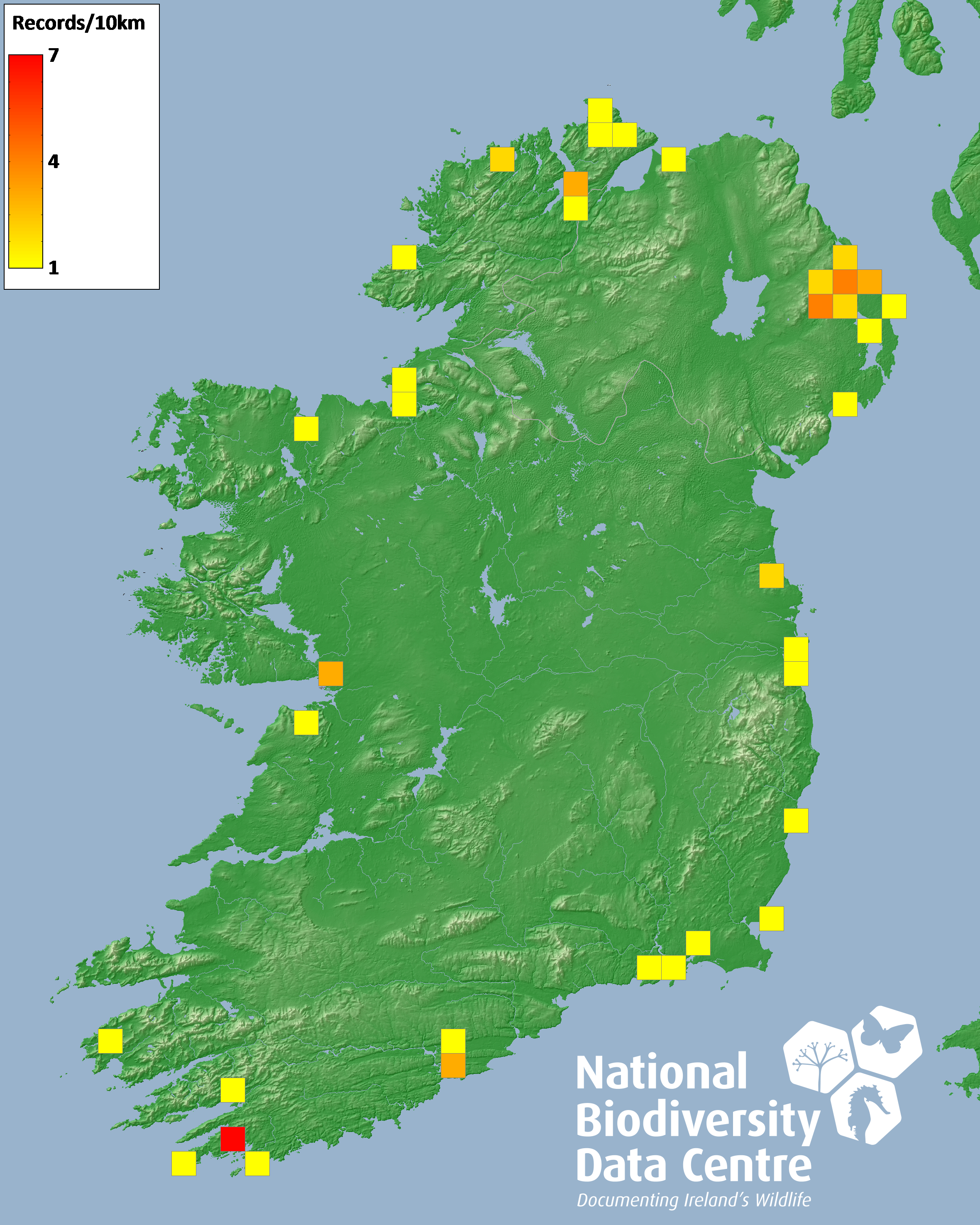 Distribution of the number of records recorded within each 10km grid square (ITM).Marine Map - 50km
