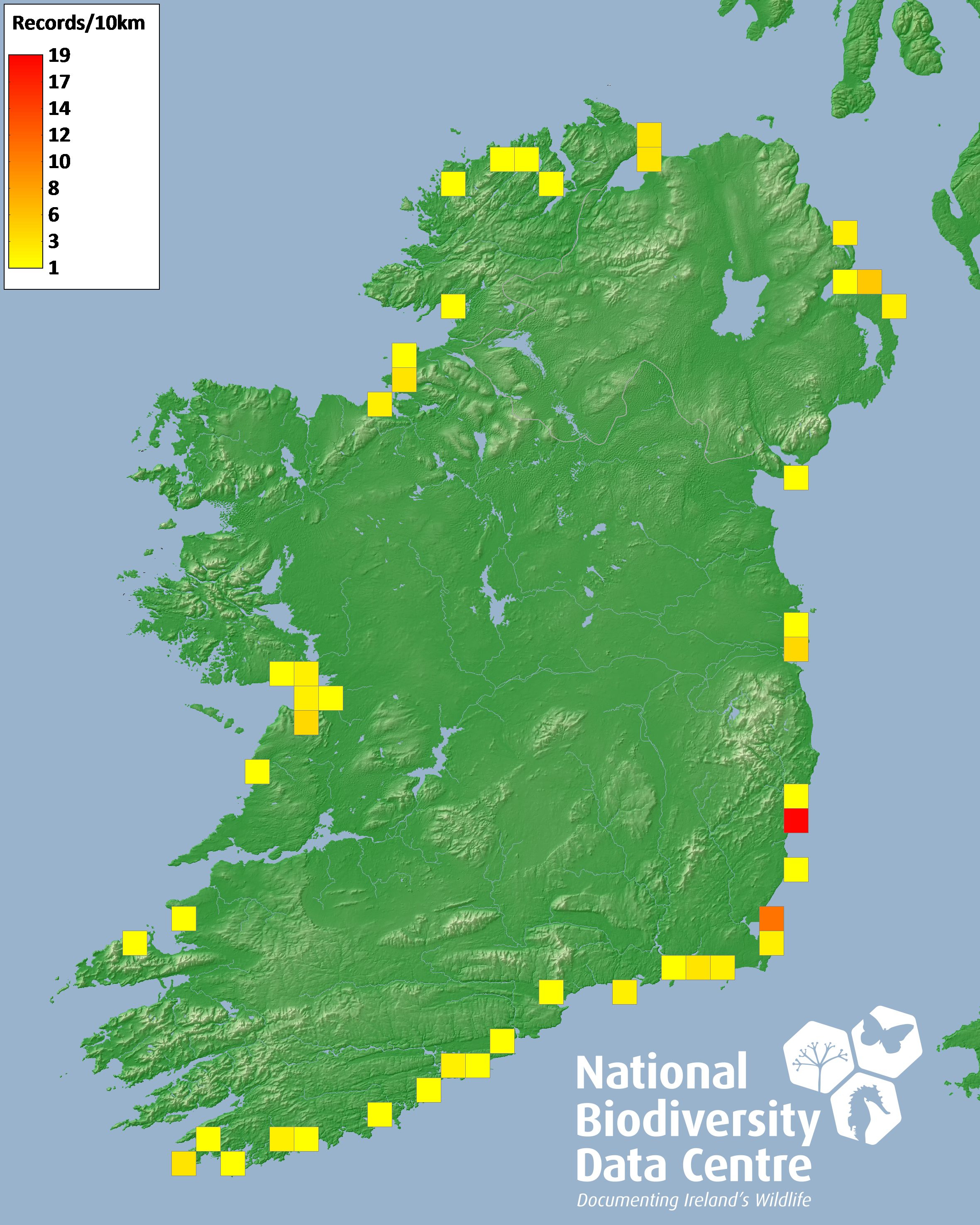 Distribution of the number of records recorded within each 10km grid square (ITM).Marine Map - 50km