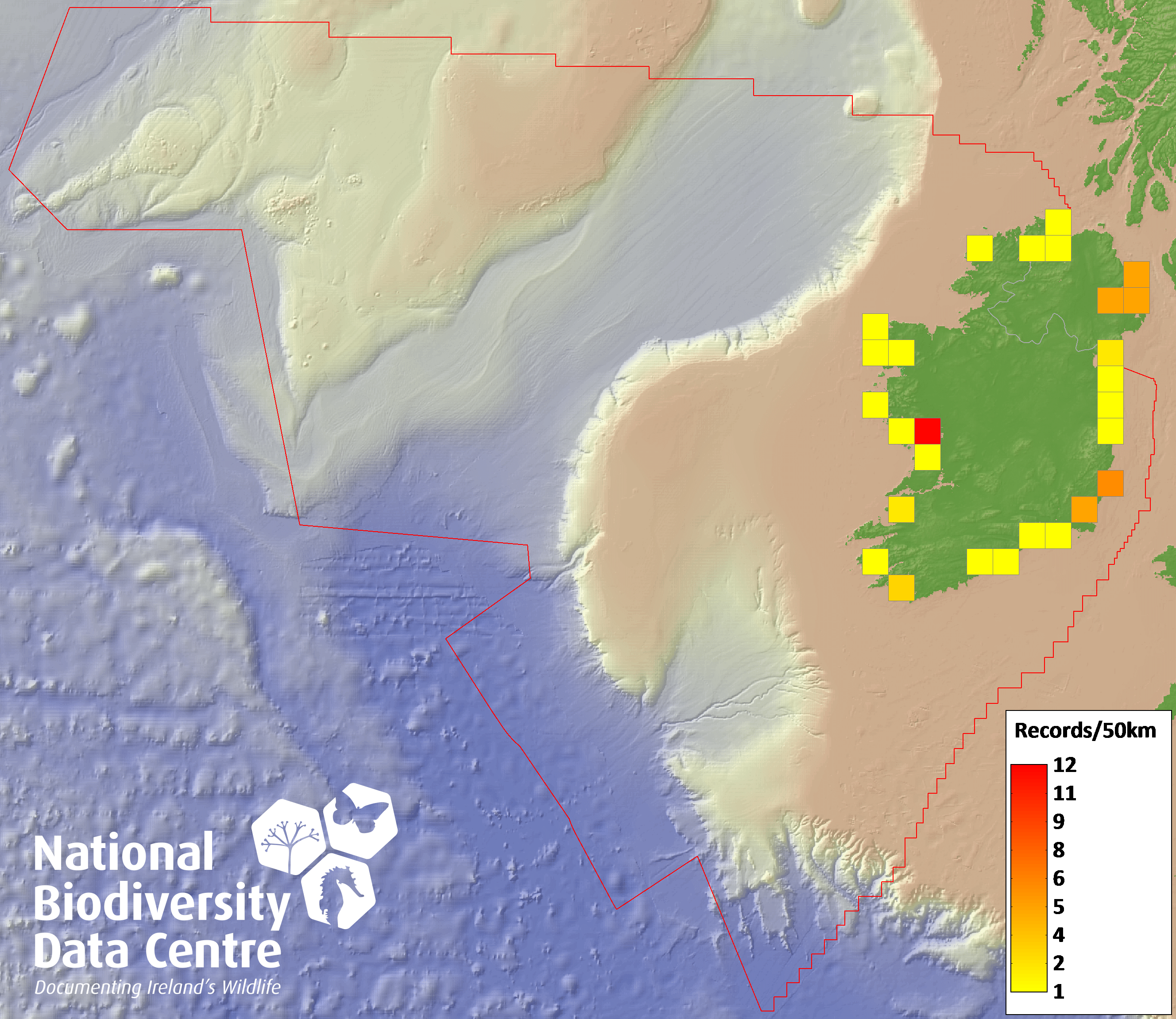 Distribution of the number of records recorded within each 10km grid square (ITM).Marine Map - 50km
