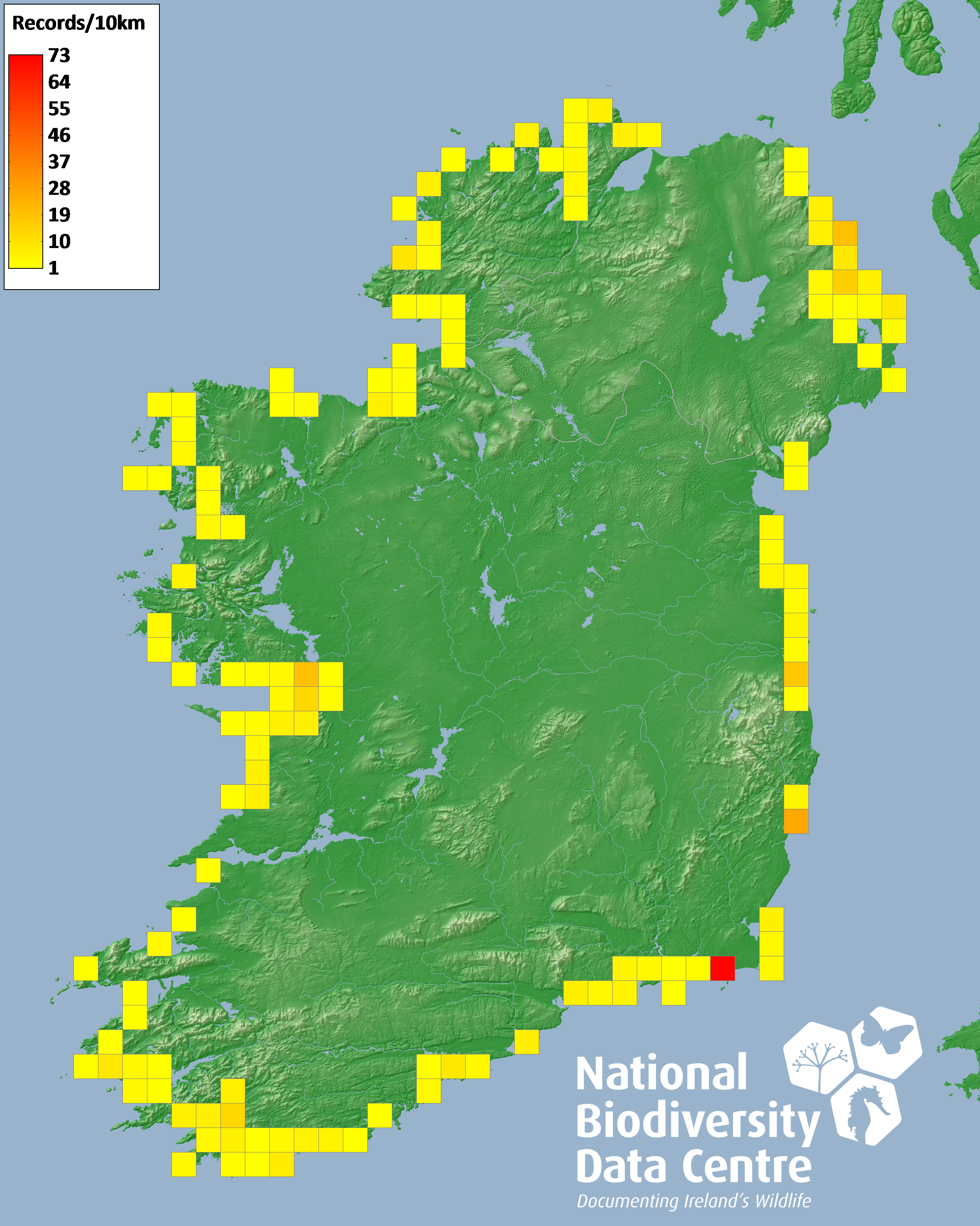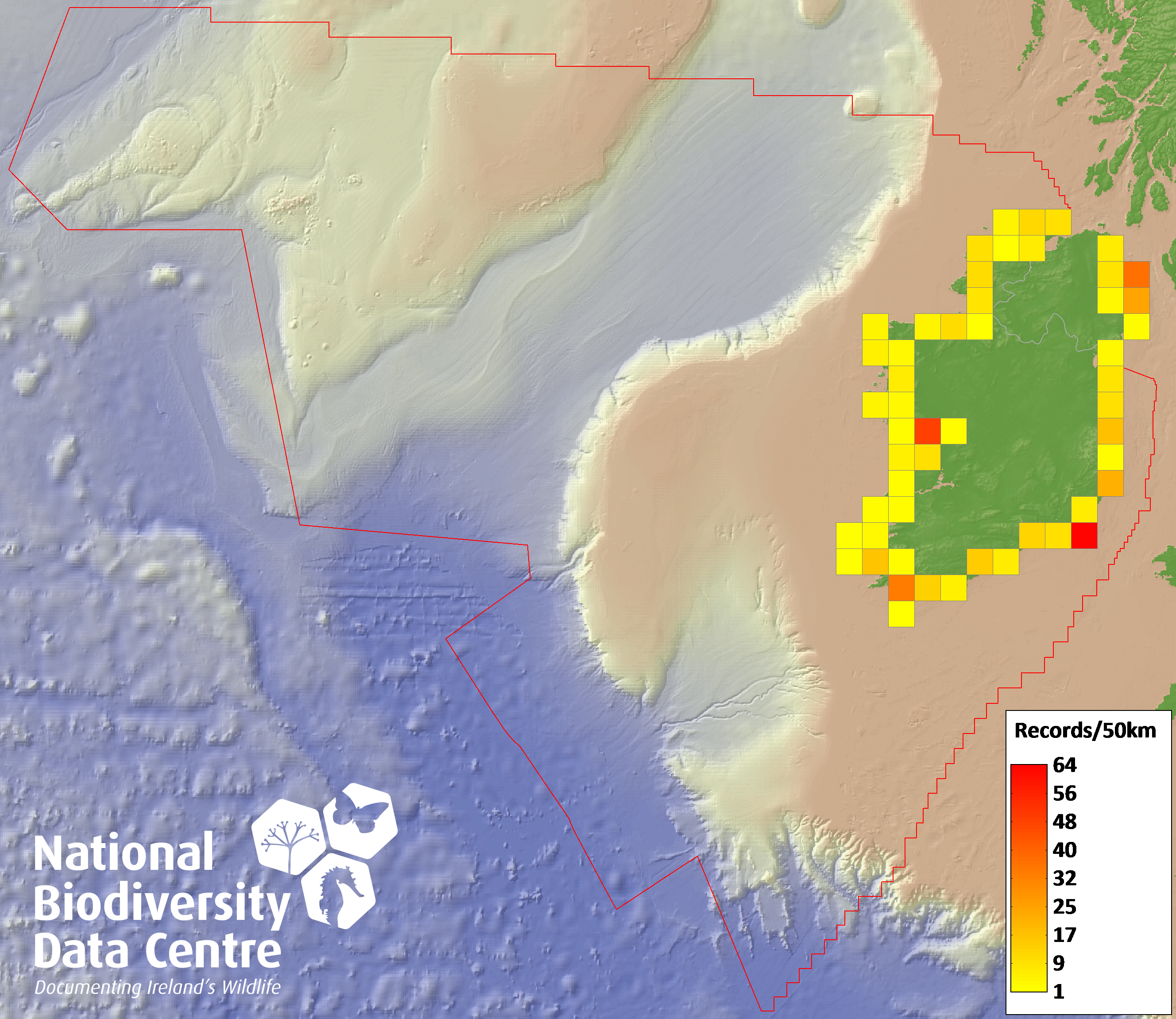 Distribution of the number of records recorded within each 10km grid square (ITM).Marine Map - 50km