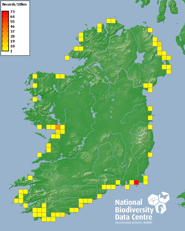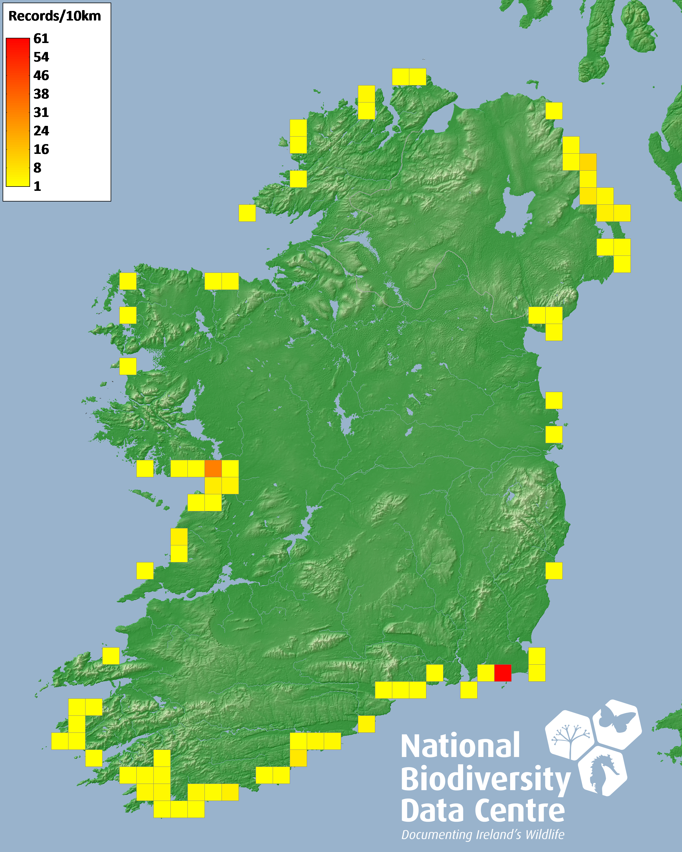 Distribution of the number of records recorded within each 10km grid square (ITM).Marine Map - 50km